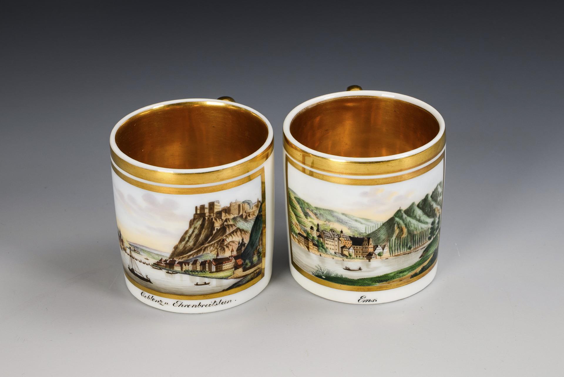 Zylindertassen mit Ohrenhenkel. Schauseitig jeweils eine Rechteckkartusche mit einer bezeichneten Ansicht: "Coblenz u. Ehrenbreitenstein" bzw. "Ems". Innen vergoldet.