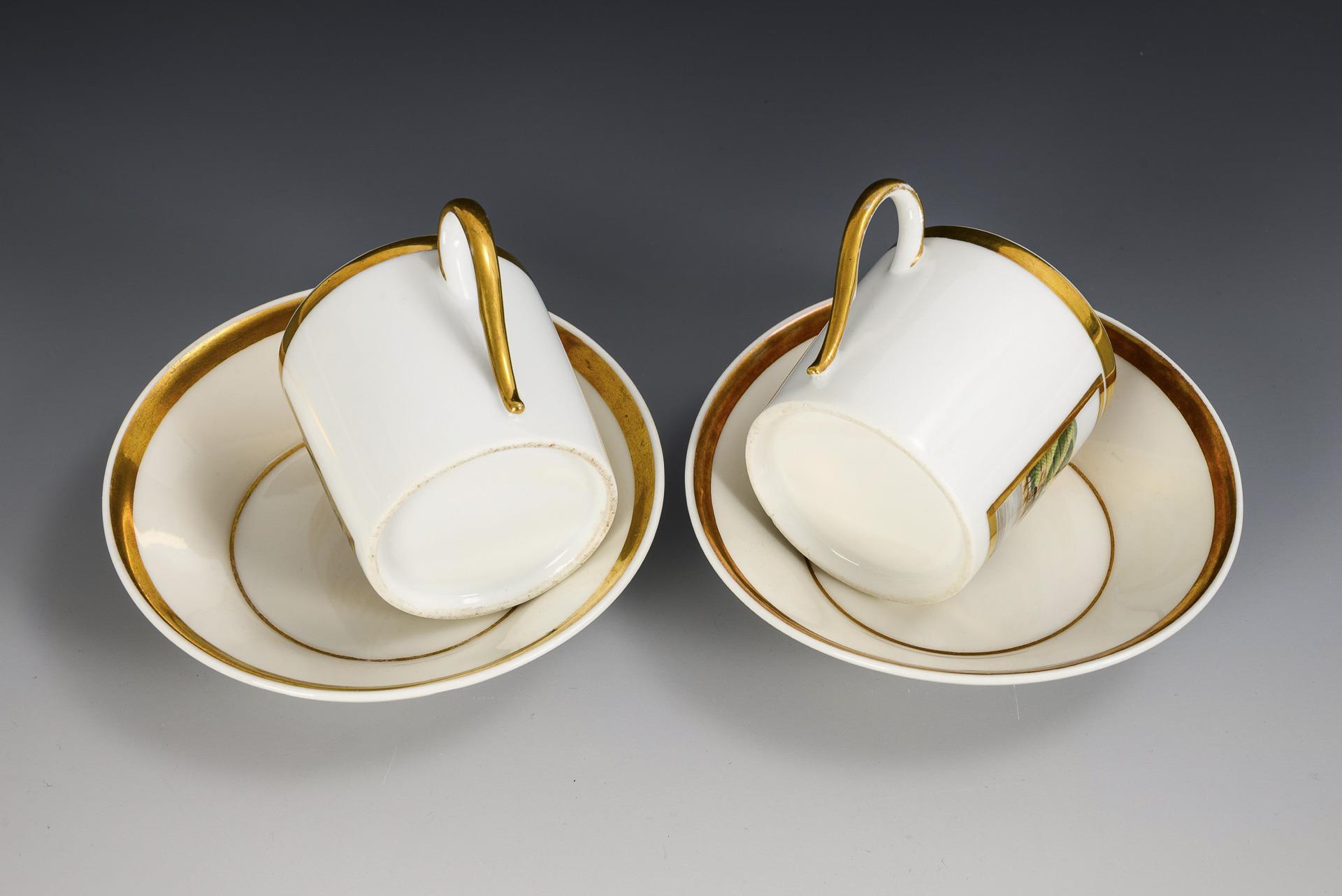 Polychrom bemalt, goldstaffiert. 2 Tassen (H 6,5 cm), 2 originale Untertassen (Ø 13 cm).