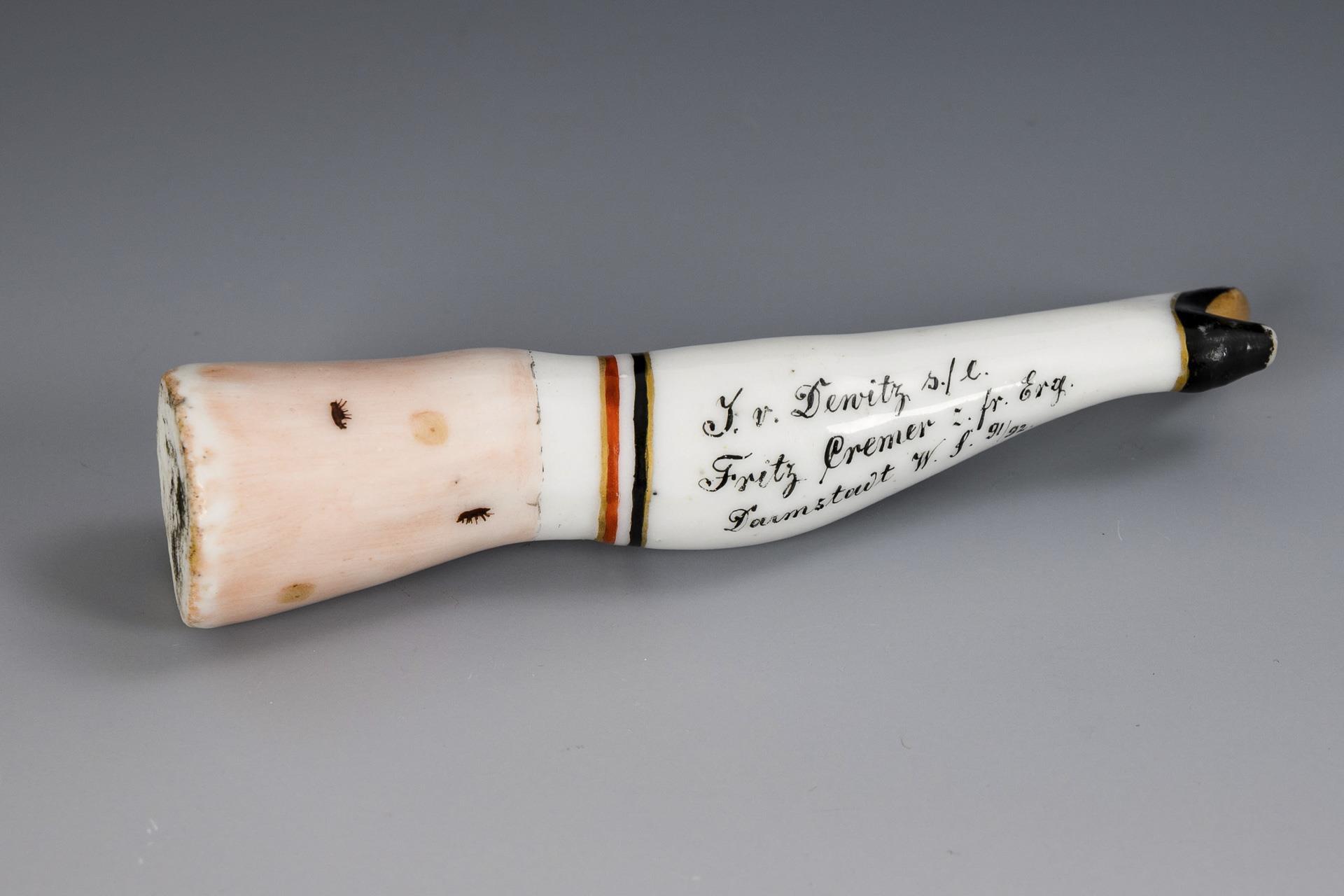 Pfeifenstopfer in Form eines Damenbeines mit Floh und Flohbissen, verso die Widmung "I. v. Denitz s./l. Fritz Cremer z. fr. Erg. Darmstadt W./S. 91/92.". Minimal berieben.