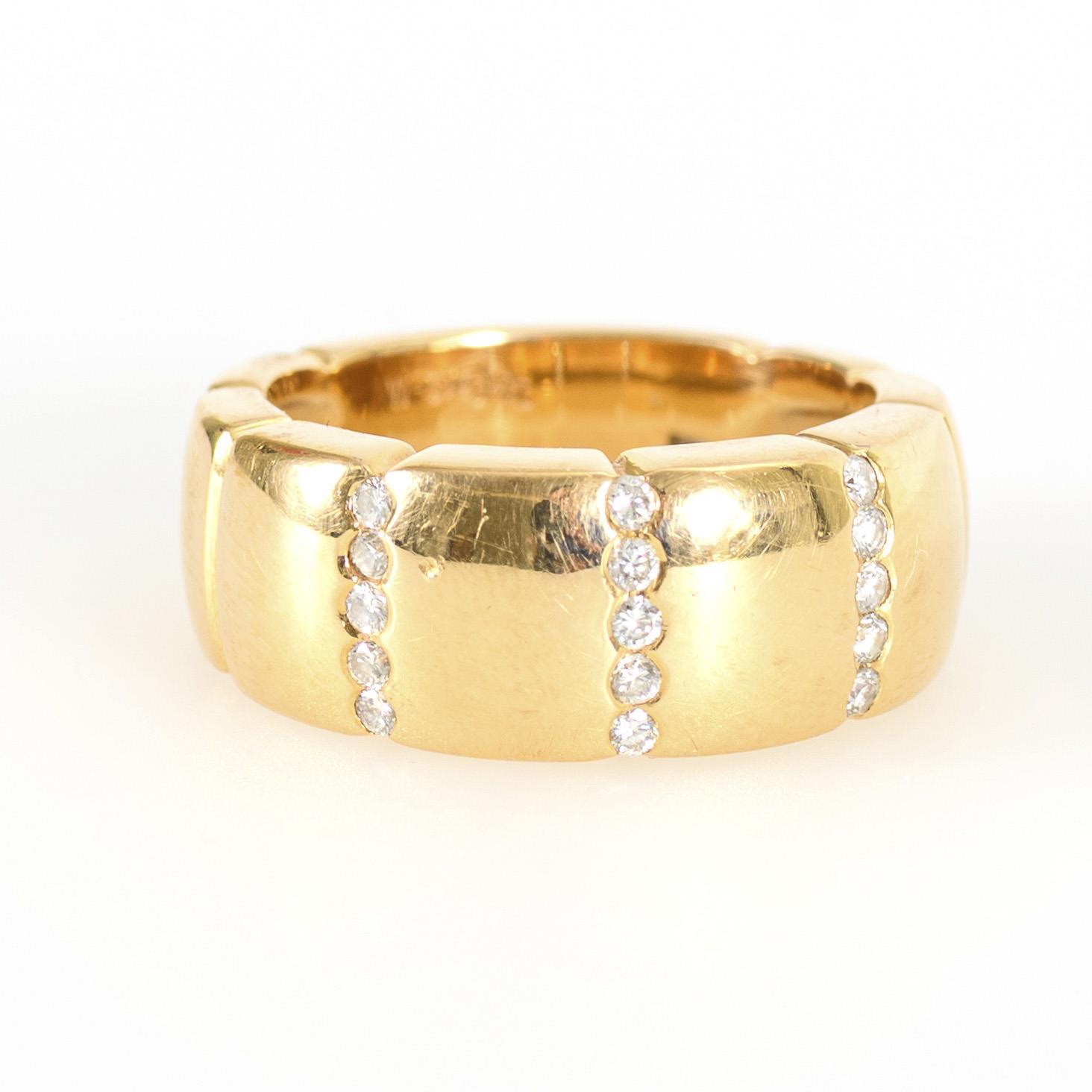 Breiter Bandring, besetzt mit 3 vertikalen, mit je 5 kleinen Brillanten ausgefassten Stegen. Leichte Tragespuren am Gold (verstärkt unterseitig), schauseitig eine kleinere Delle.
