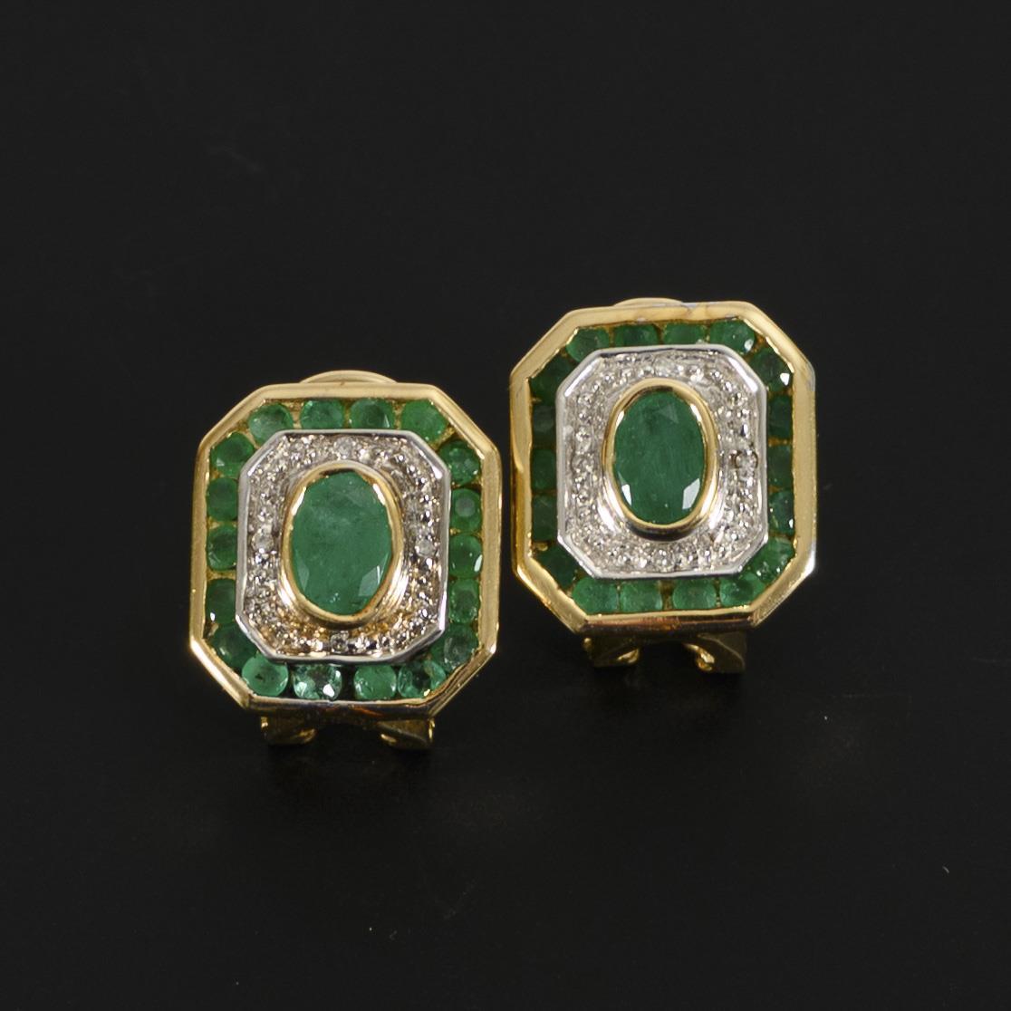 Paar Clipstecker mit grünem Farbsteinbesatz, wohl Smaragde. Die Ohrringköpfe in abgeschrägt-rechteckiger Form und zweifarbiger Ausgestaltung; zentral ein ovalfacettierter grüner Farbstein in Zargenfassung umgeben von einem Weißgoldband, dieses mit 4 kleinen Achtkant-Diamanten besetzt und wiederum abgeschlossen durch kleine, kanalgefasste grüne Farbsteine.