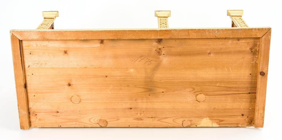 Holzgehäuse mit profilierten Frontpilastern und alten farbigen Tapeten. Ca. 34 x 79 x 34 cm.