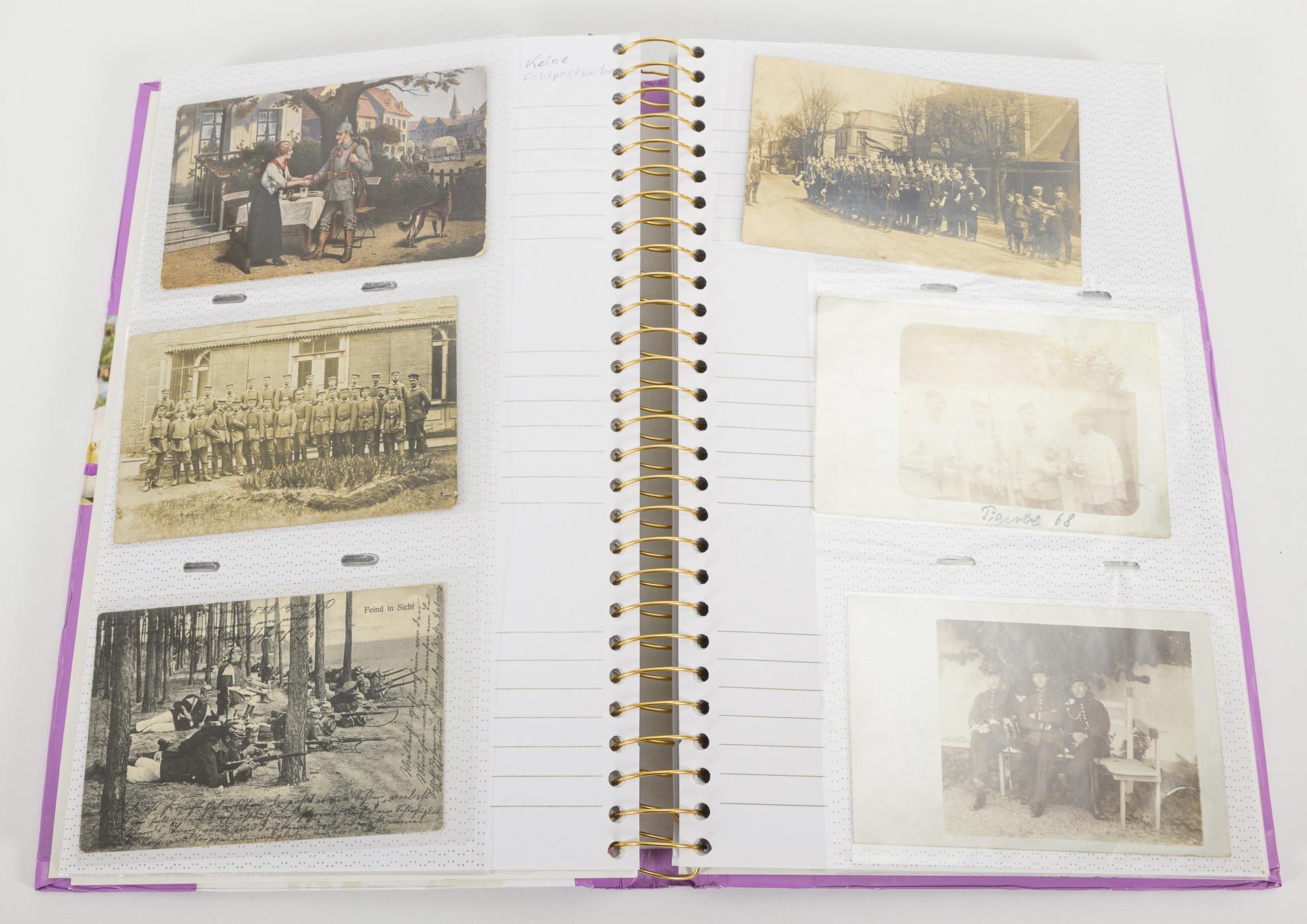 Alle als Feldpost gelaufen, viele mit Militärmotiven, darunter auch "Lager von Sissonne (Aisne) Farman Doppeldecker vor dem Flugzeugschuppen". Im modernen Album, rosé mit Irisblüte.