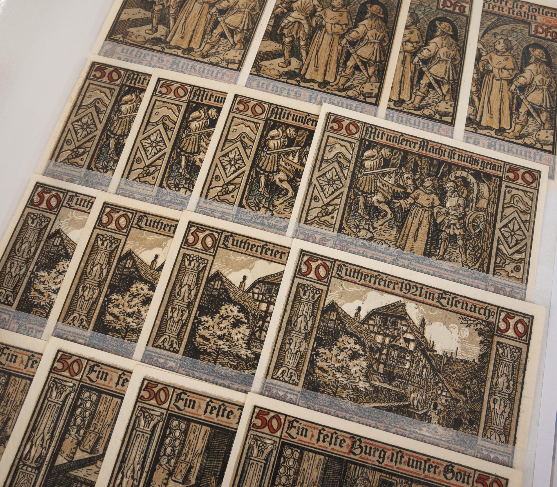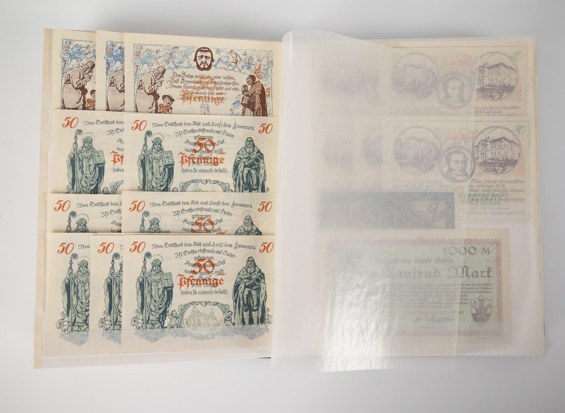 4 Philatelie-Alben mit Notgeld, laut beiliegender Aufstellung des Sammlers vornehmlich Deutschland, frühe 1920er Jahre, hier vor allem aus Gotha und Erfurt. Auch etwas Notgeld aus Frankreich und Österreich.