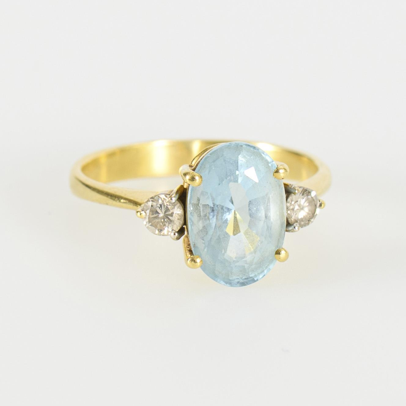 Ring mit Trilogie aus zwei Brillanten und einem ovalfacettierten, hellblauen Farbstein, wohl Aquamarin, zwischen einer zarten Schiene. Blauer Farbstein mit minimalen Chips, diese nicht augenfällig und erst unter zehnfacher Vergrößerung sichtbar.