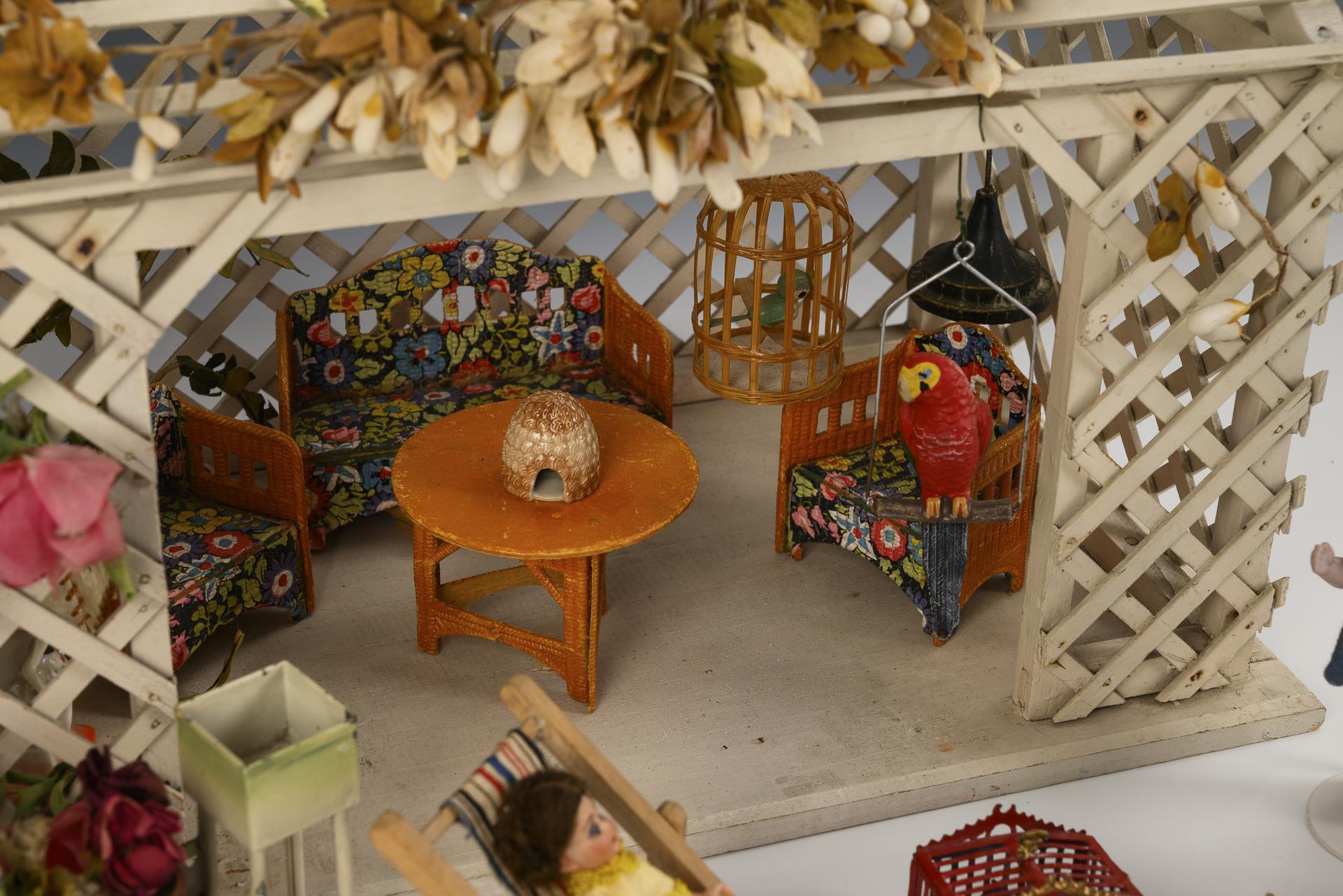 Schöner Pavillon mit Einrichtung, darunter Sitzgruppe aus geprägter Pappe (Karl Schreiter, Buchholz/Erzgebirge), Blumentisch aus Blech, Liegestuhl, 2 Vogelkäfige etc. Dazu 4 Biskuit-Püppchen. Leichte Altersspuren.