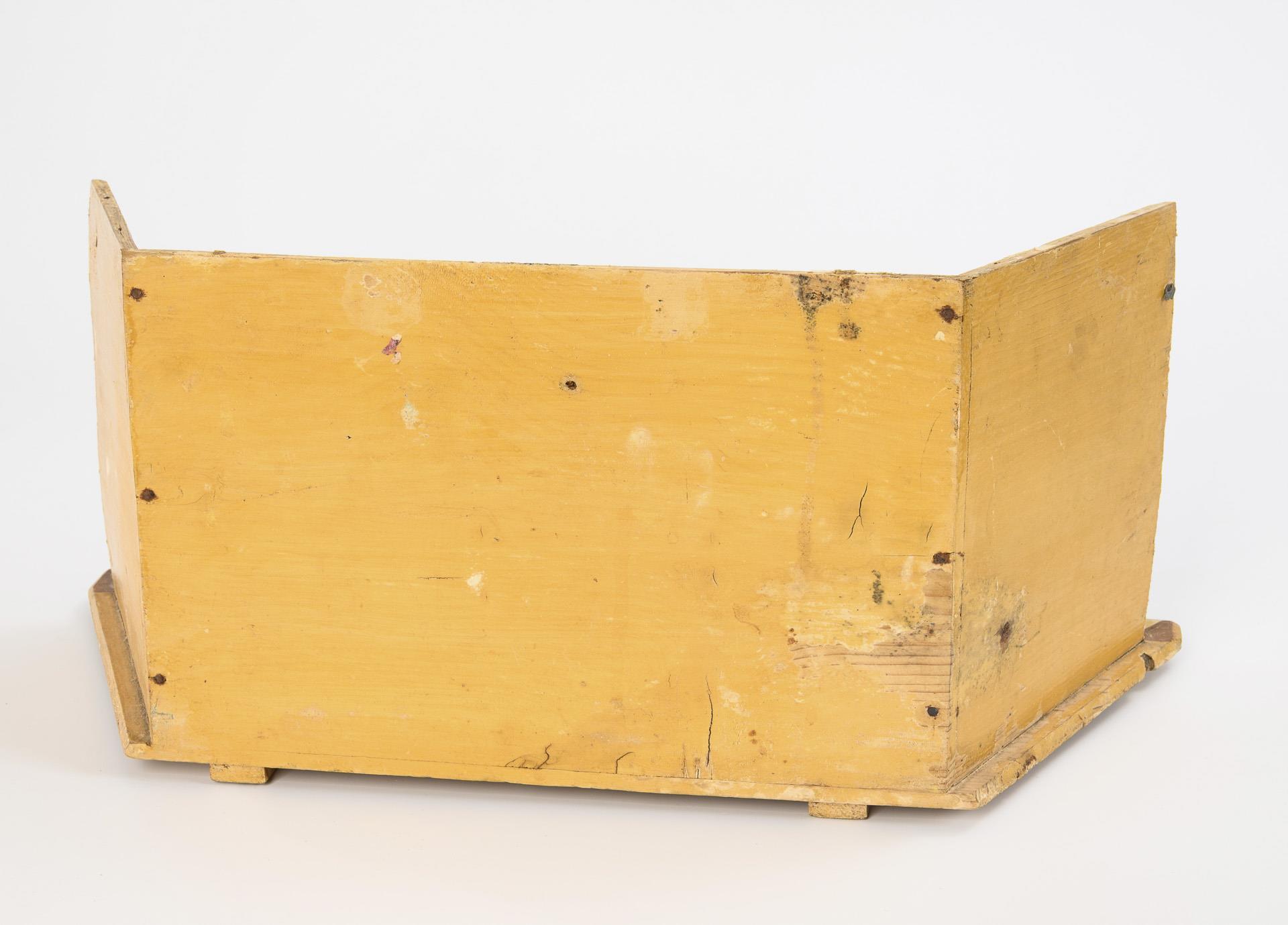 Holz, außen gelb gestrichen, innen tapeziert. 20 x 48 x 19 cm.