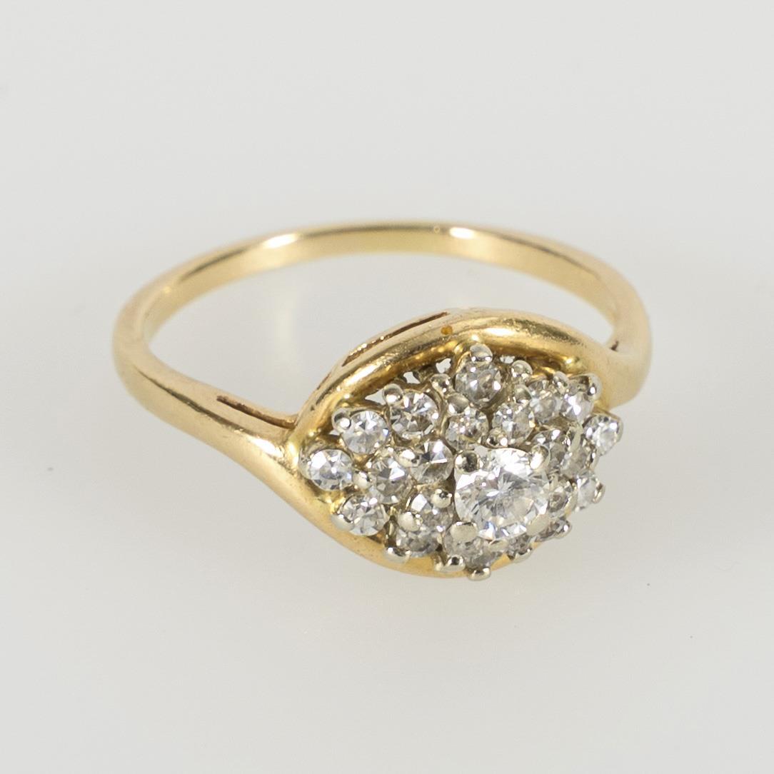 Ring mit zuckerhutartig erhöht angeordnetem Cluster aus krappengefassten Diamanten. Unterseitig mit Tragespuren: ein tieferer Kratzer im Gold, schauseitig nicht sichtbar.