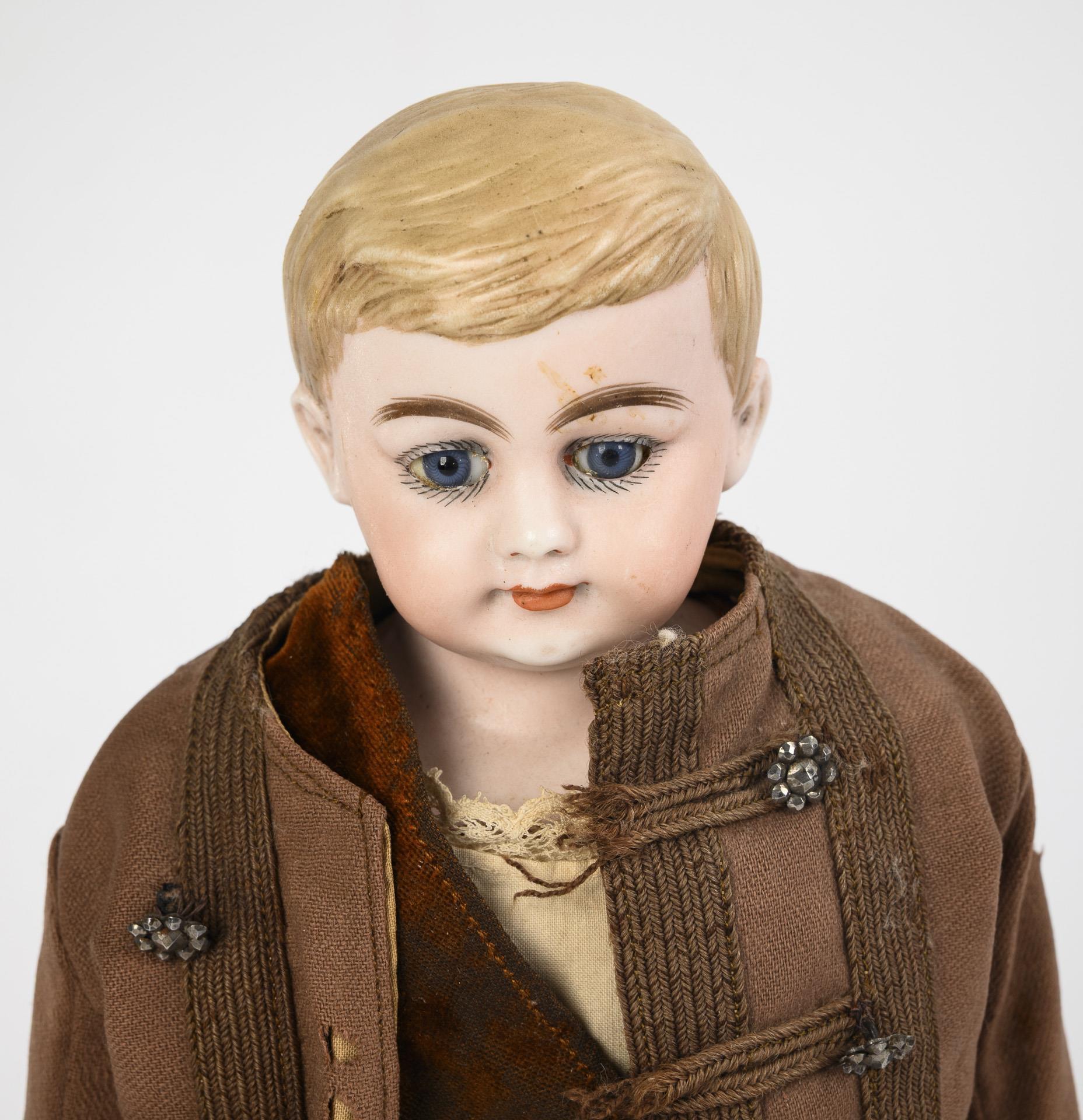 Feste blaue Augen, geschlossener Mund, modellierte blonde Haare. Lederkörper, Biskuitarme, Massebeine. Brauner Anzug mit Samtweste.