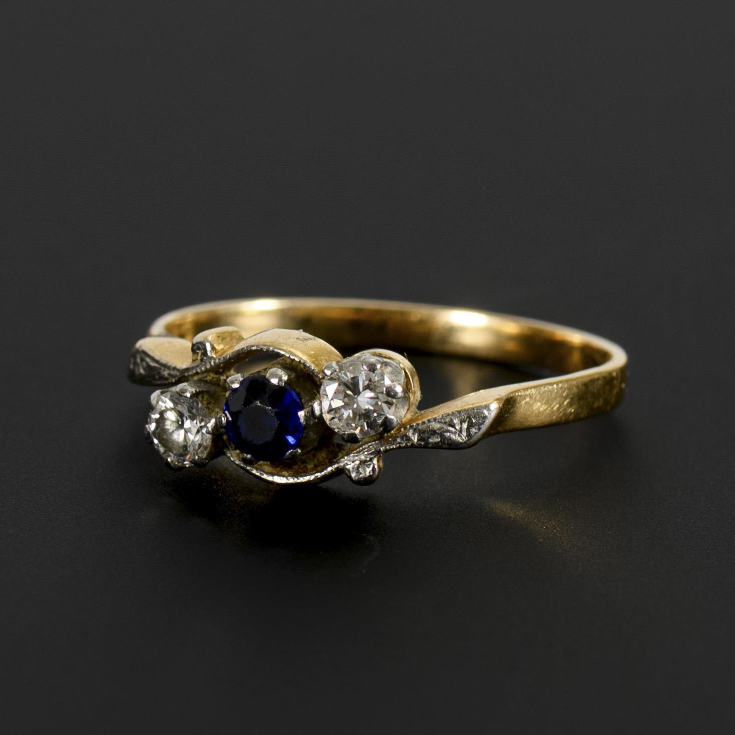 Ring aus der Zeit um 1900, ausgefasst von einem blauen Farbstein, wohl Saphir, flankiert von 2 Brillanten in einem zweifarbigen Entwurf.