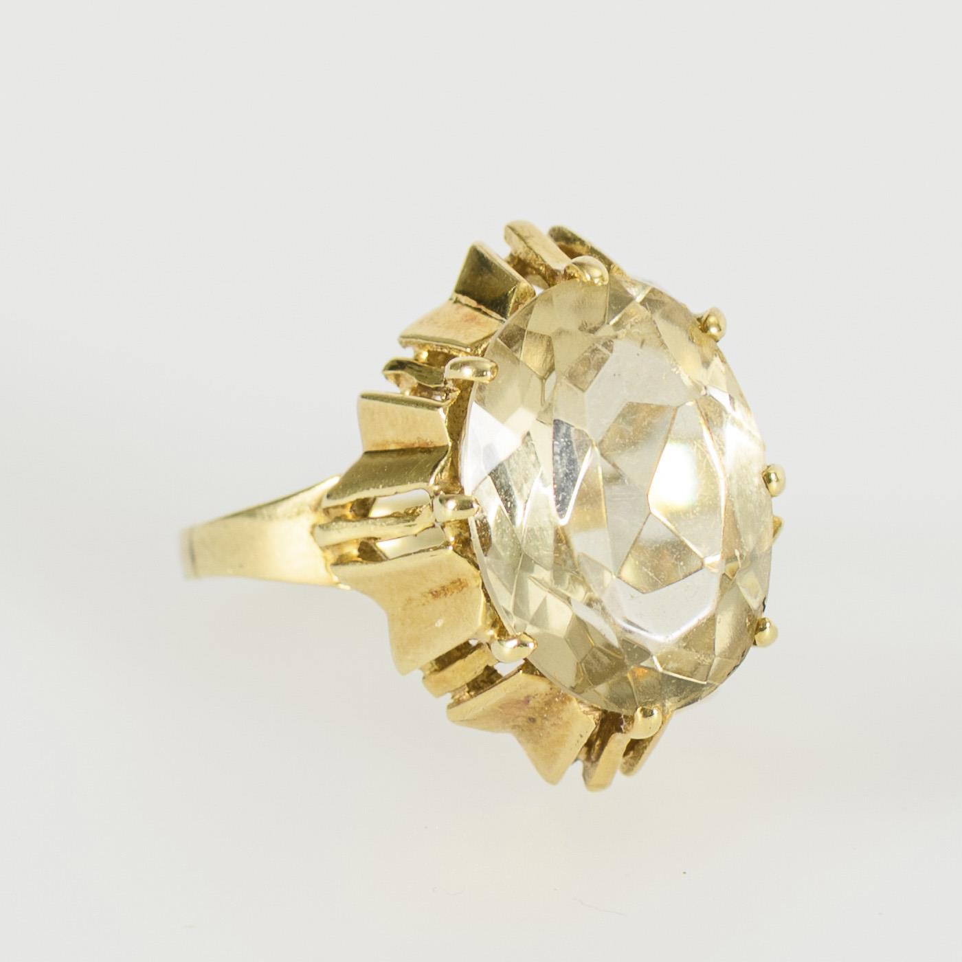 Ring mit ovalfacettiertem, blassgrünen Farbstein, in einem modernistisch-erhaben gestalteten Ringkopf.