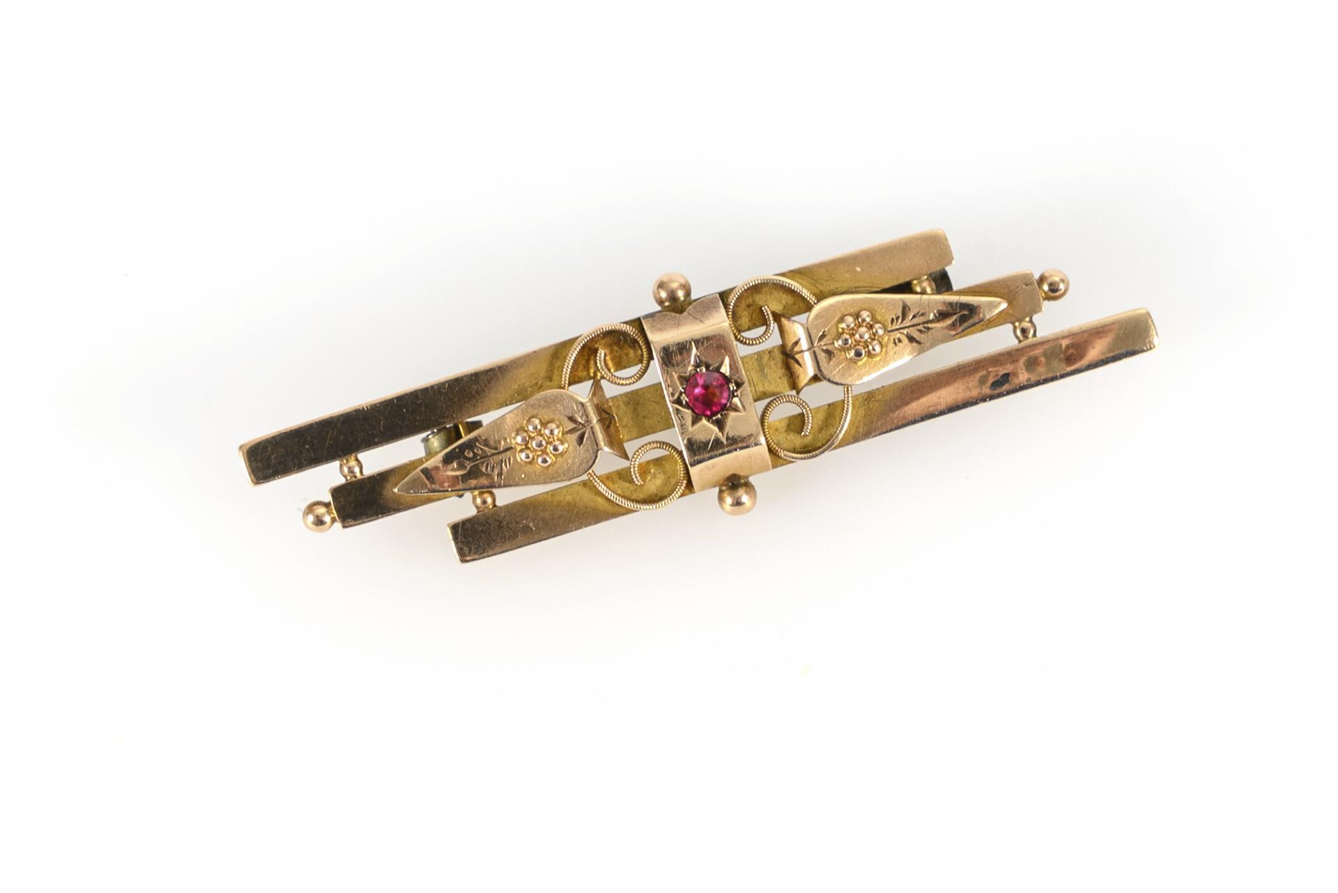 Brosche aus dem spätviktorianischen England mit einem zentralen, kleinen roten Farbstein oder entsprechender Synthese in breiter, stabbroschenartiger Gestaltung mit Blütenverzierungen. Alters- und Tragespuren: vereinzelte, kleine Dellen, Oxydationsspuren. Broschierung historisch erneuert.