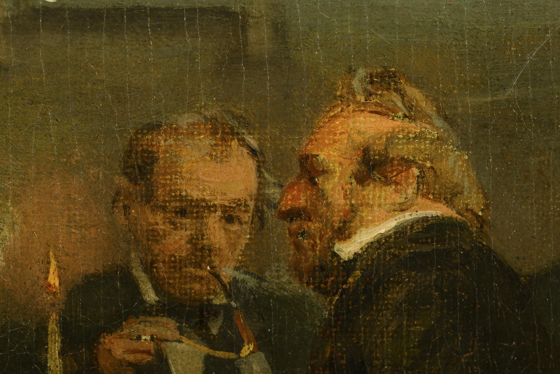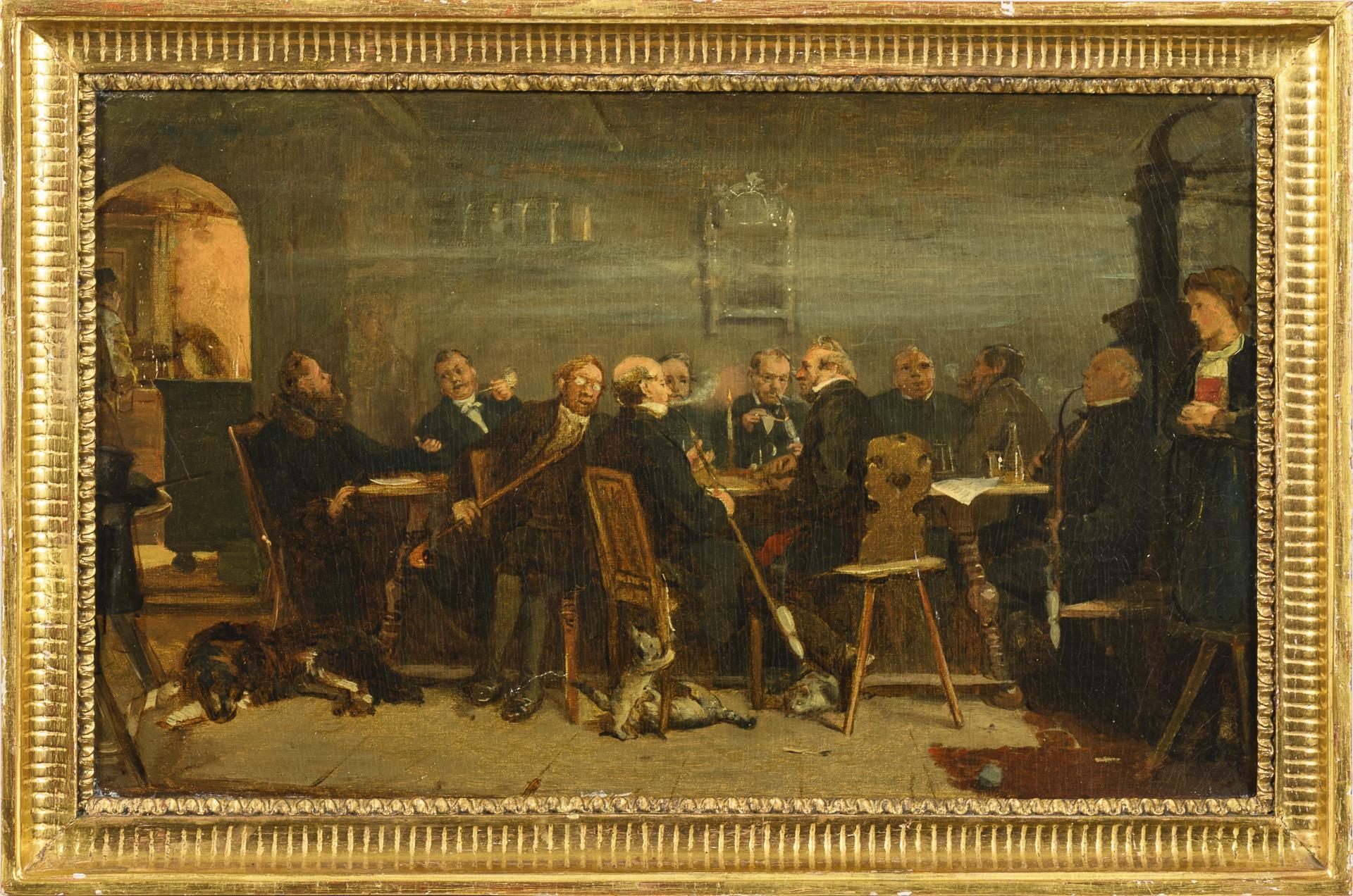 Viele Männer in mehreren Gesprächen an einer großen Tafel in der Wirtsstube. Leinwand doubliert.