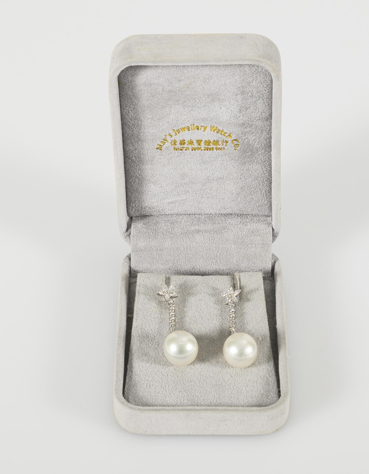 Weißgold 750 gestempelt. Länge der Ohrringe je ca. 45,61 mm, Durchmesser der Perlen je ca. 14,19 mm. Zusammen 13,8 g.