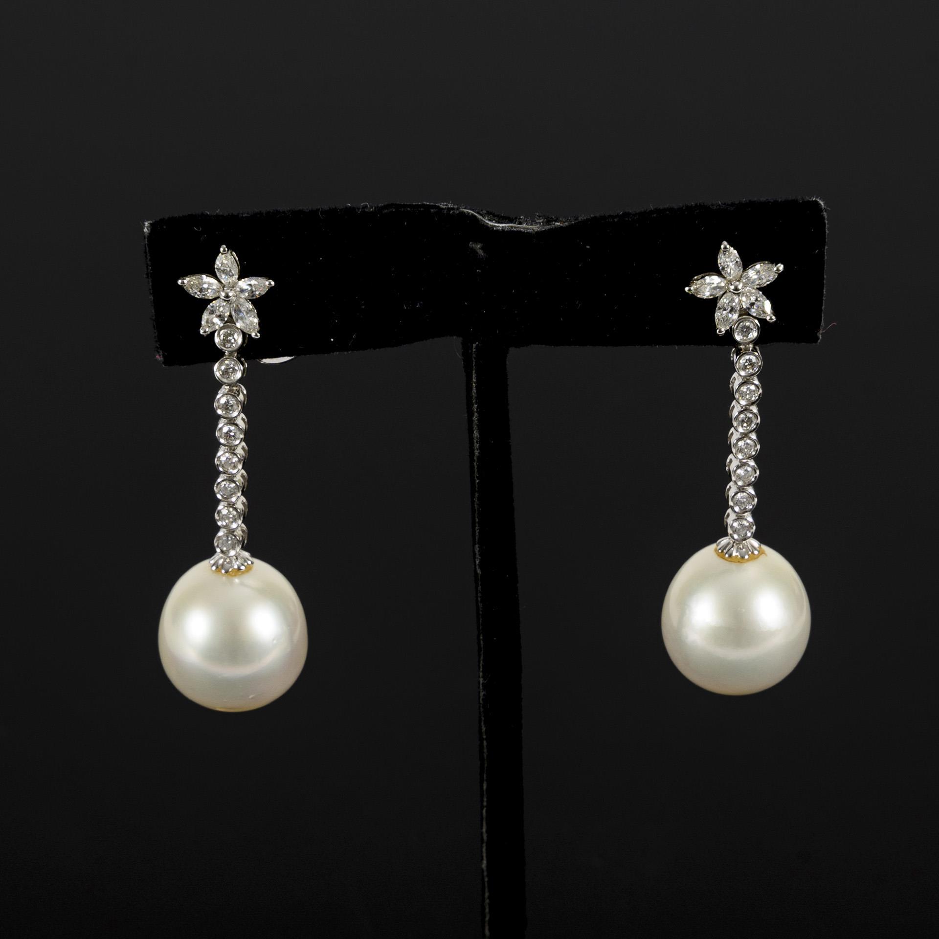 Qualitätvolles Ohrhängerpaar mit langen Abhängungen, die je durch eine große, leicht ovale Perle, wohl Südseeperlen, abgeschlossen werden. Die Ohrstecker sind aus je 5 zu einer Blüte arrangierten Diamanten im Baguetteschliff zusammengesetzt, die Abhängungen mit insgesamt je 8 zargengefassten Brillanten besetzt.