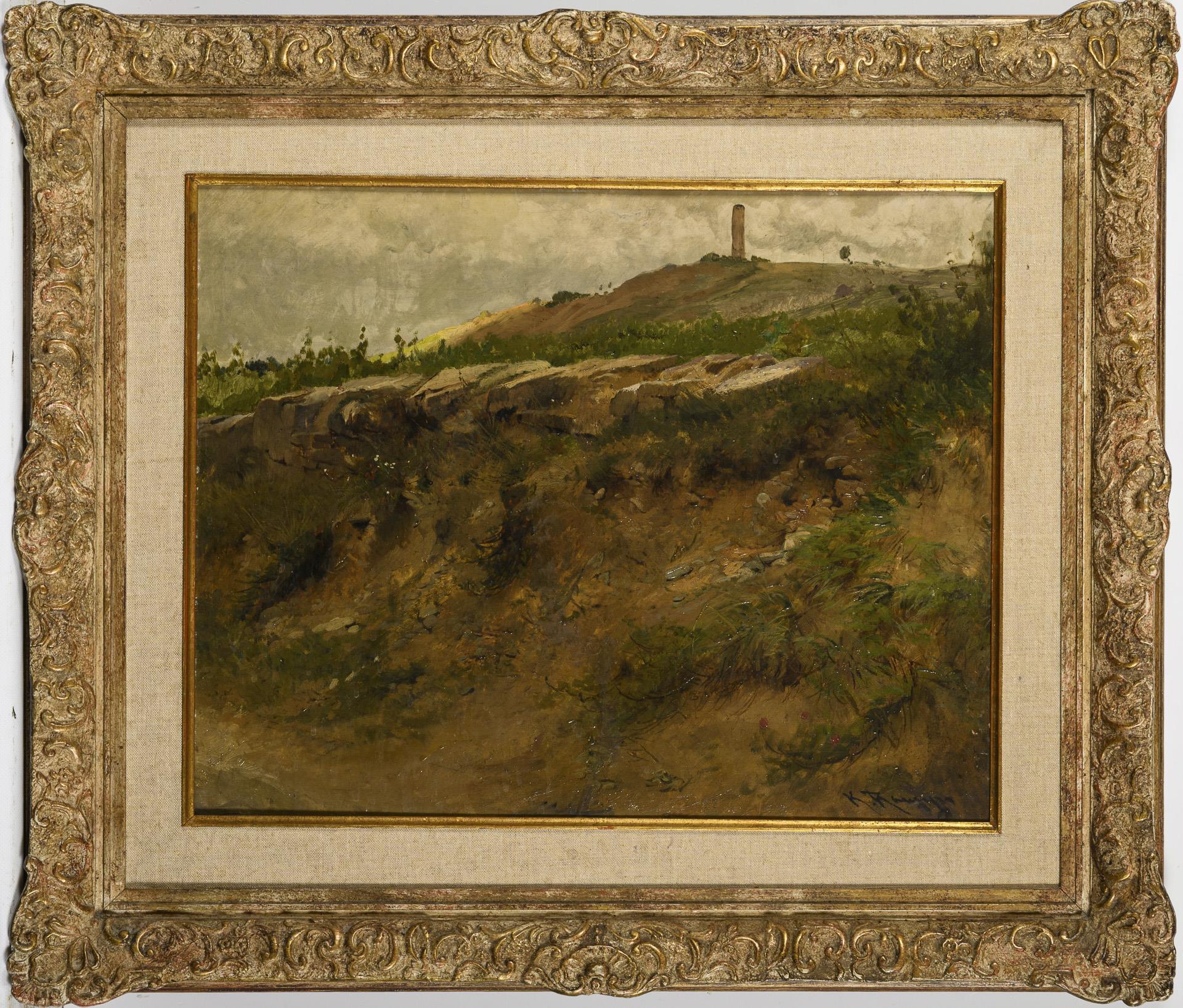 Blick einen Hügel hinauf zu einem Turm unter bedecktem Himmel. Leichte Altersspuren.