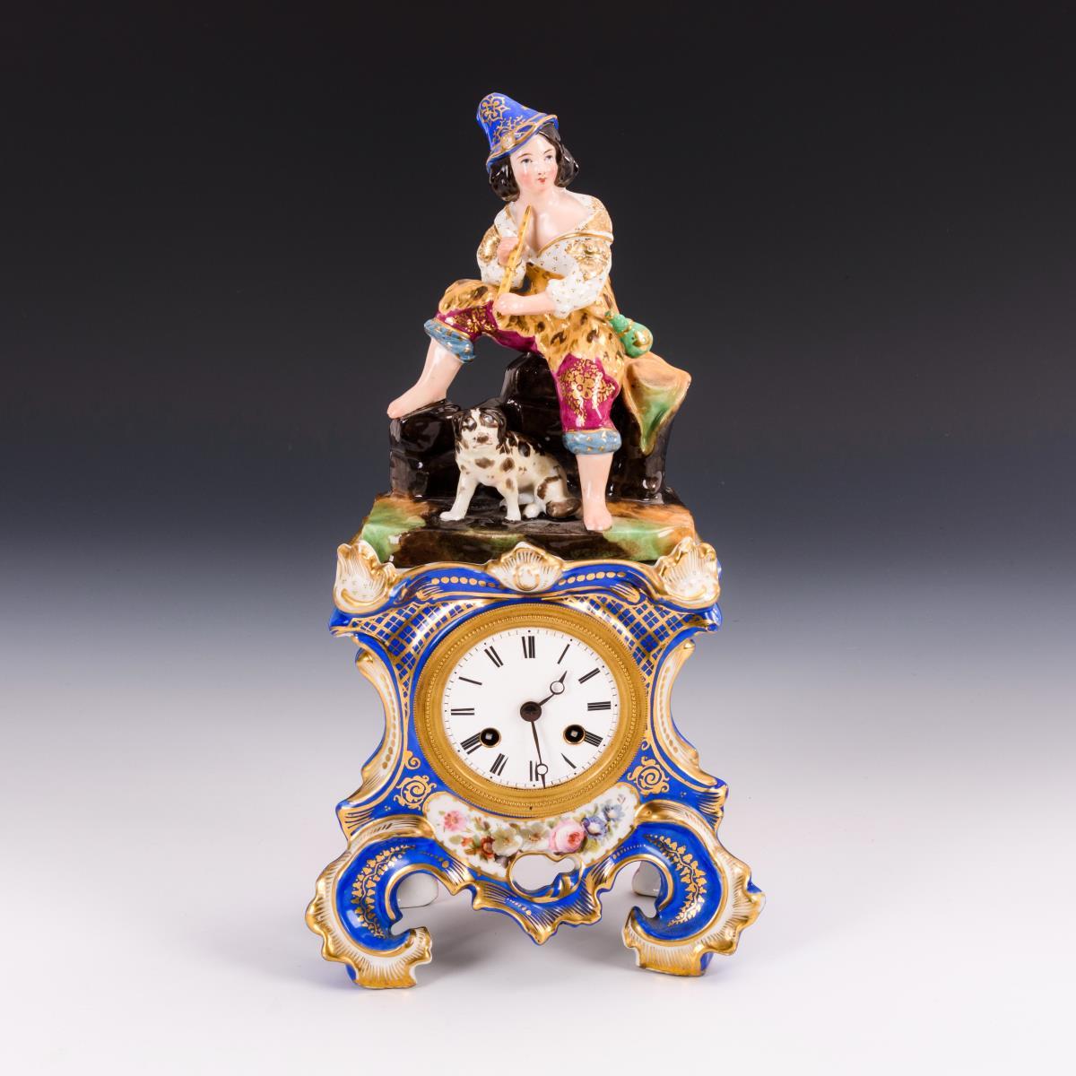 Rocaillegehäuse mit blauem Fond, reicher Goldmalerei und Blumengirlande. Als Bekrönung die Porzellanplastik eines sitzenden Knaben mit Flöte und Hund. Uhr mit Halbstundenschlag auf Glocke (läuft nicht). Mit Schlüssel und Pendel. Verso am Gehäuse Haarriss in einem Rocaillefuß, minimaler Goldabrieb.