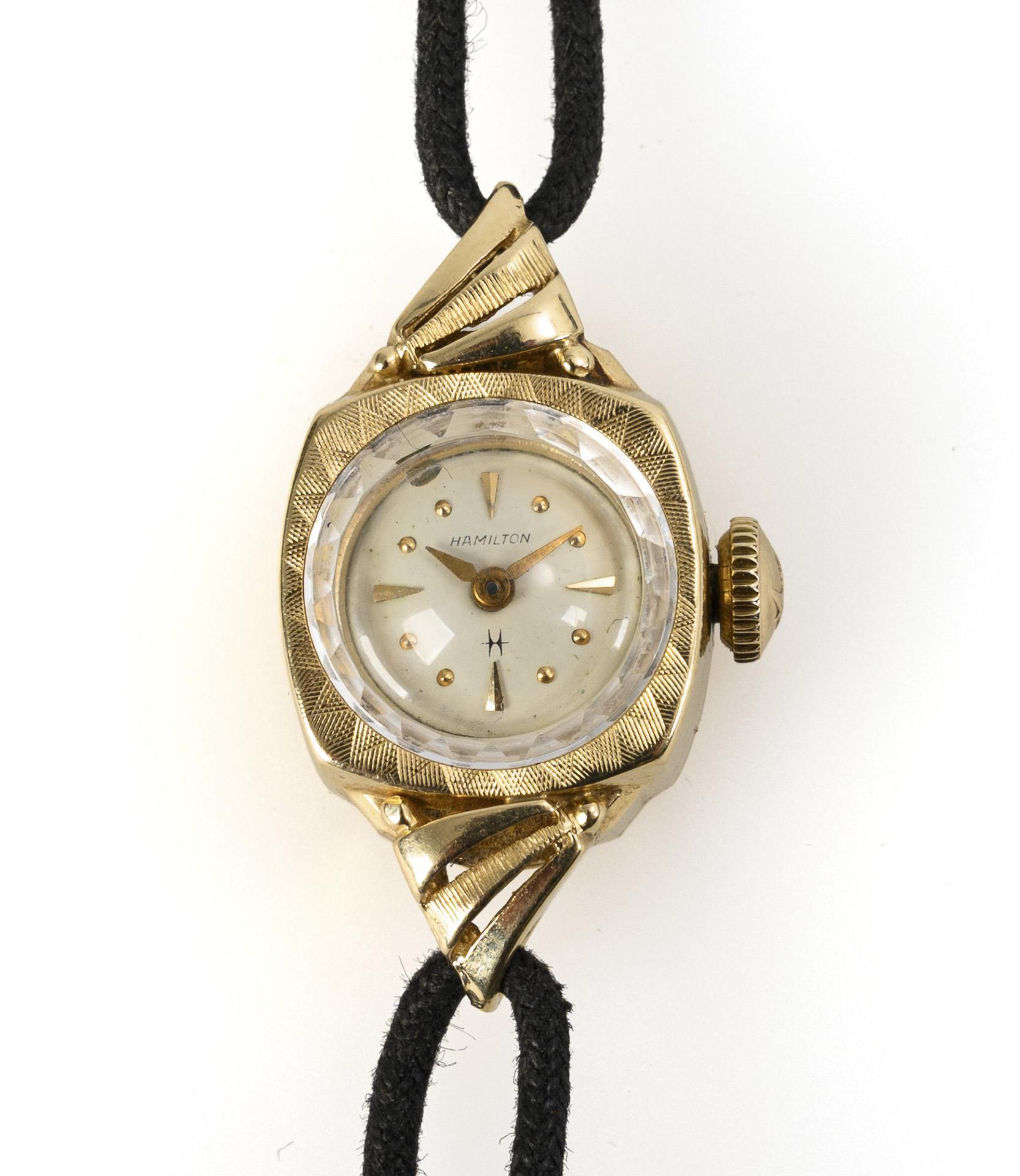 Gemarktes Federwerk Hamilton 761 mit Kronenaufzug. Im Kurzzeittest funktionstüchtig. Quadratisches Gehäuse mit facettierter Lünette und gefächerten Abschlüssen, silberfarbenes Ziffernblatt mit Stundenmarkierungen und Dauphine-Zeigern. An schwarzem Textilband mit vergoldeter Klippschließe. Schließe berieben.