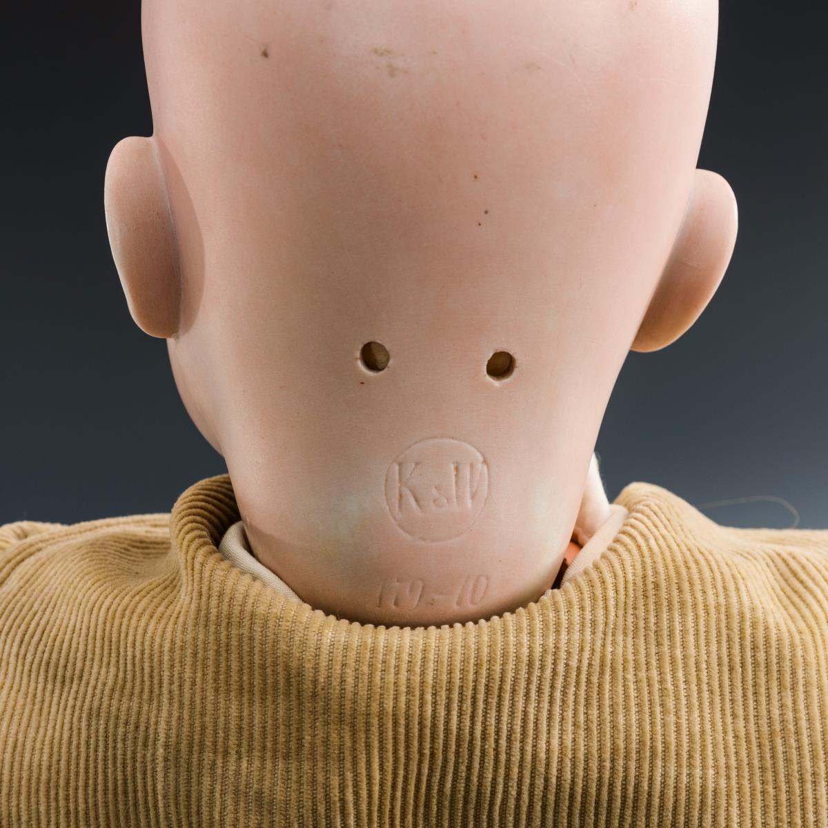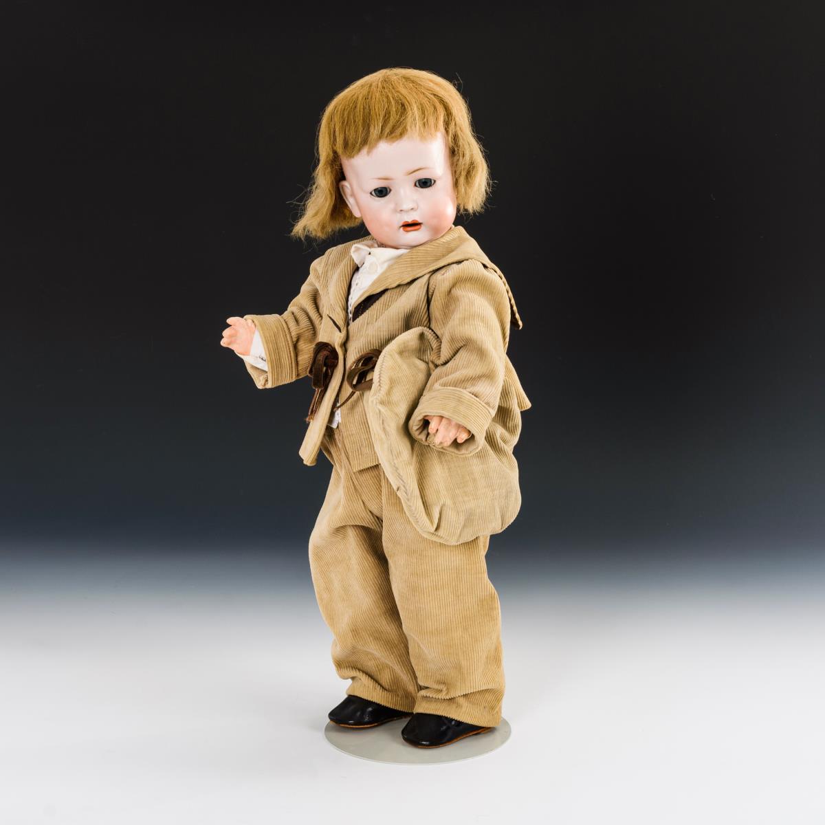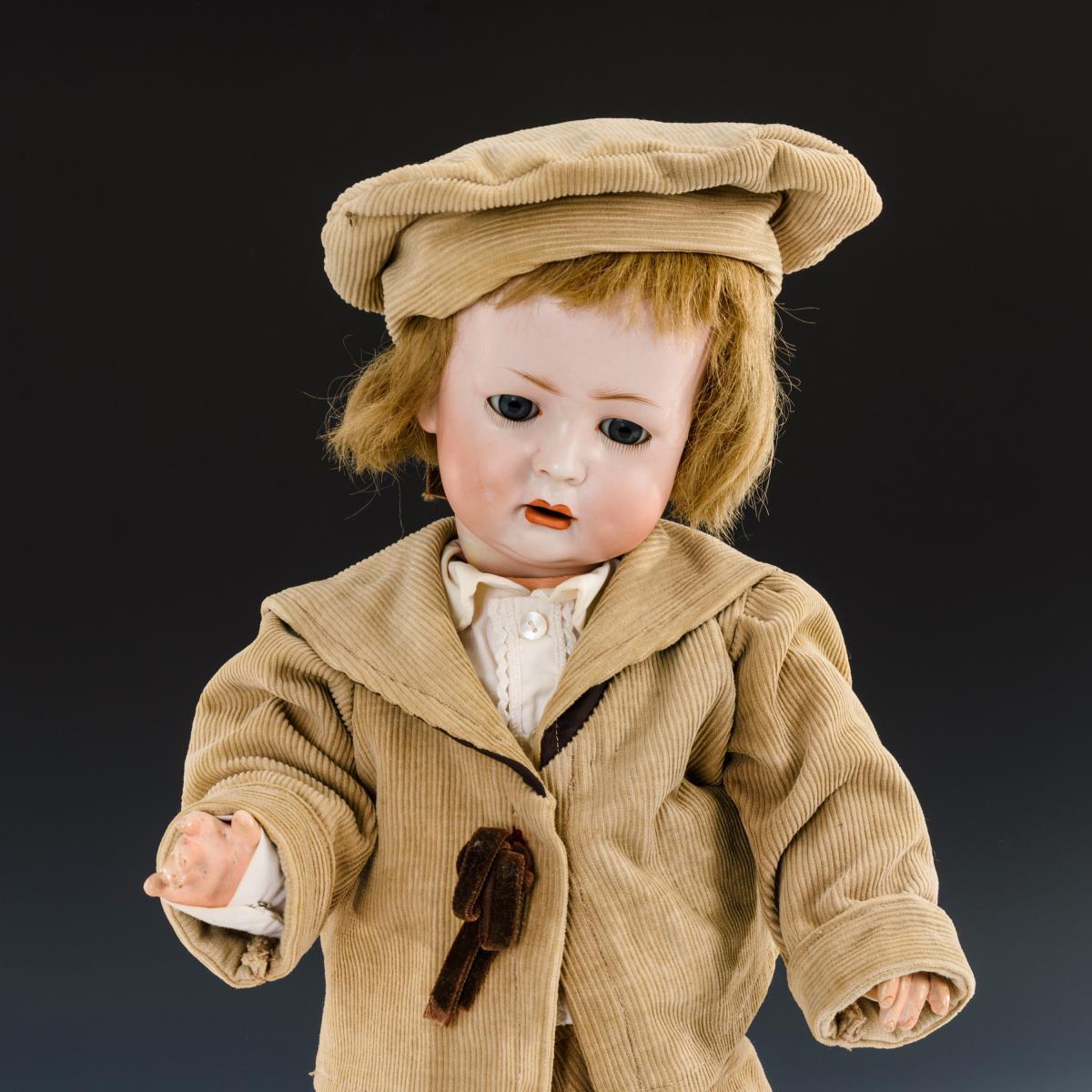 Kurbelkopf, blaue Schlafaugen, blonde Echthaarperücke. 5-teiliger Stehpuppenkörper mit verstummter Stimme. Brauner Cordanzug, passendes Barrett. Riss an der rechten Wange.