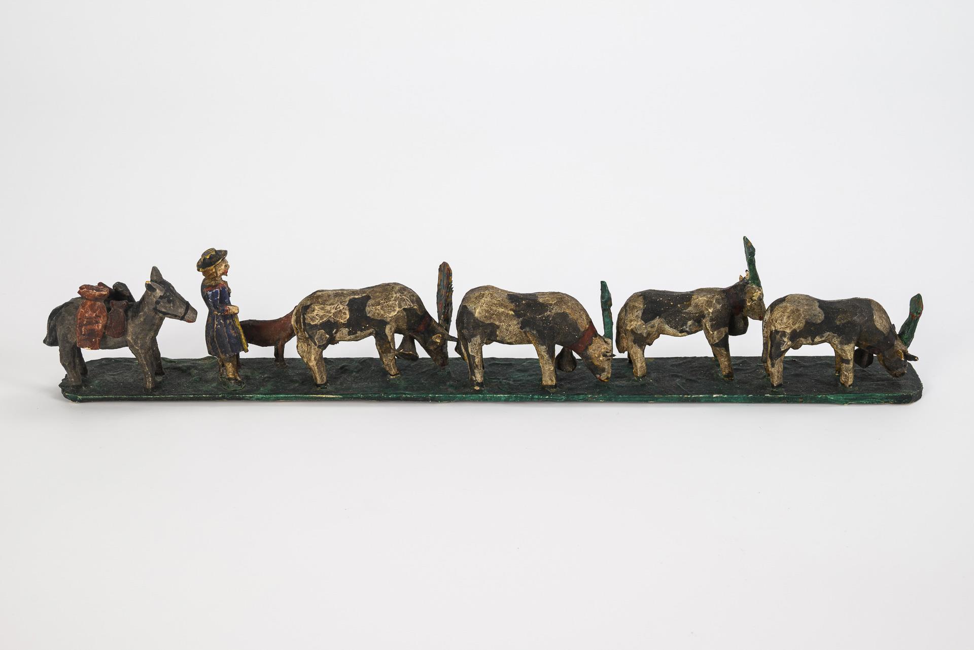 Alpenländische Volkskunst mit 4 handgeschnitzten Kühen, Hund, Hirte und Esel. Altersspuren, kleine Defekte. 8,5 x 44 cm. / Erzgebirgischer Bergmann in Uniform. Sockel wohl ergänzt. H 16,5 cm.