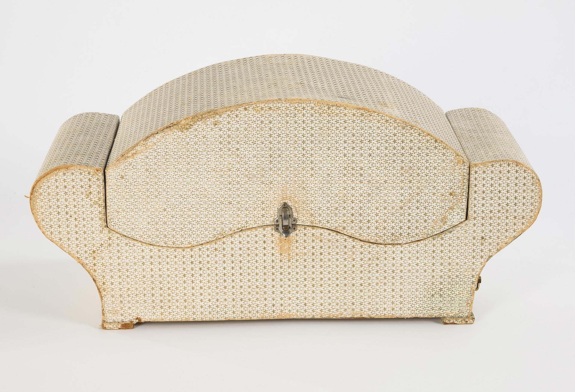Weißer Kasten mit schlafendem Kind, das die Augen öffnet und schließt, während die Spieluhr Mozarts "Kleine Nachtmusik" spielt. Werk intakt. Rechte Hand mit 2 bestoßenen und einem geklebtem Finger. Kopf und Arm wohl ursprünglich auch beweglich.