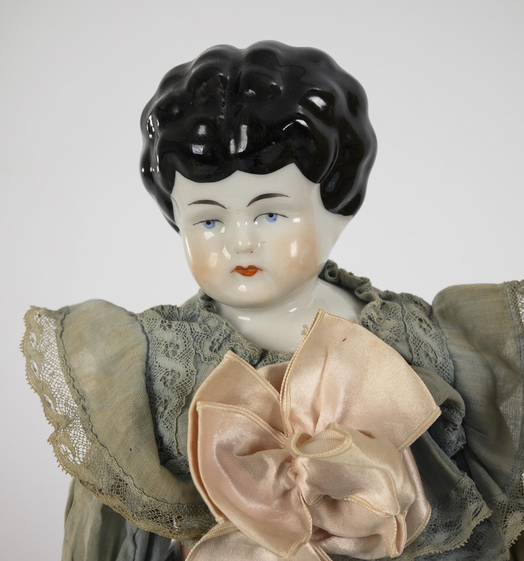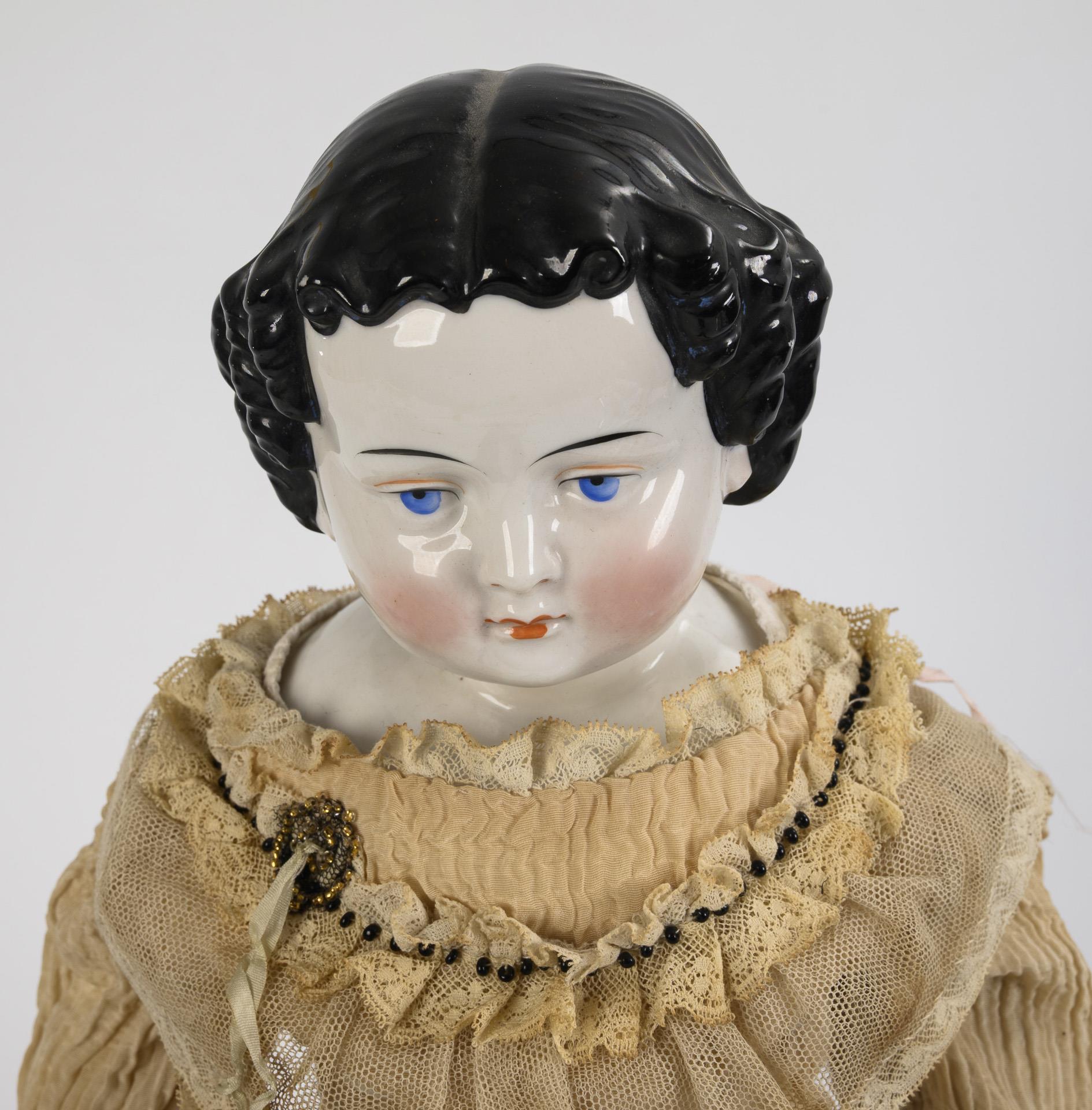 Beide mit glasiertem Brustkopf, gemalten blauen Augen, modellierten schwarzen Haaren. Die größere mit Lederkörper, Biskuitarmen und hellem Kleid mit schwarzem Spitzenschal (L 60 cm)./ Die kleinere mit Stoffkörper, weißen Biskuitgliedern, modellierten Schuhen und hellblauem Kleid (L 38 cm). Köpfe und Glieder: keine Defekte sichtbar. Altersspuren.