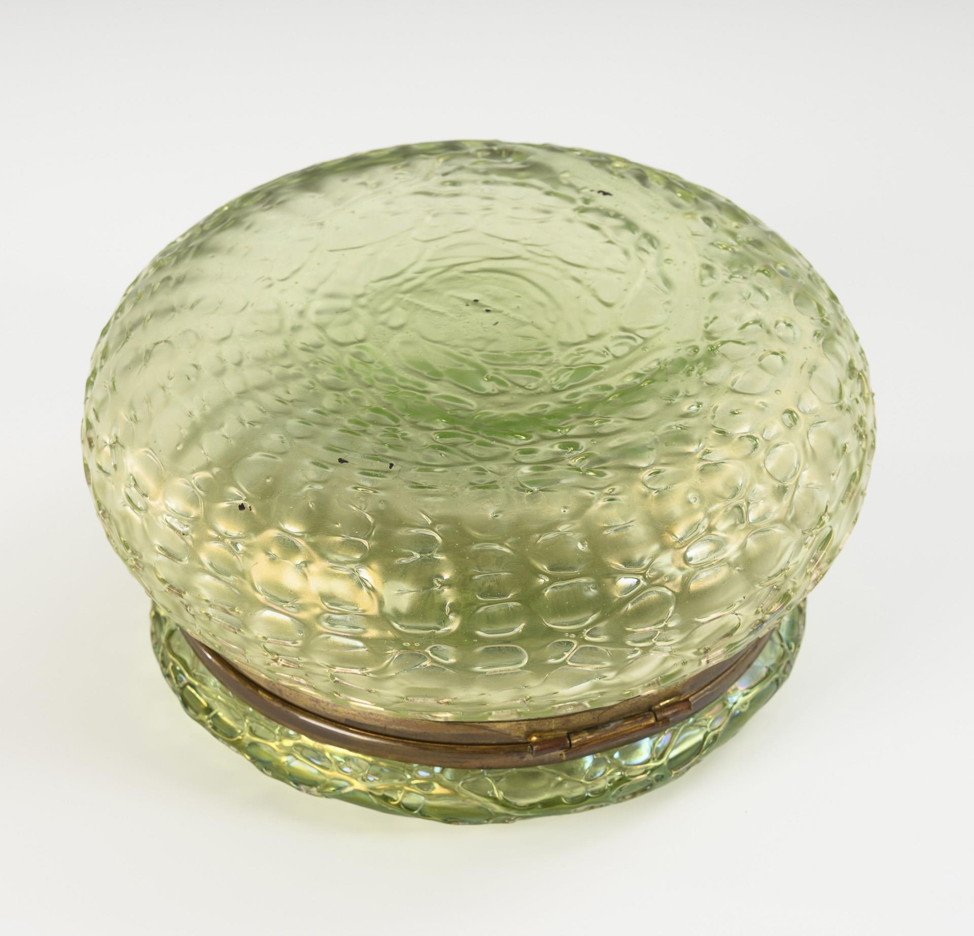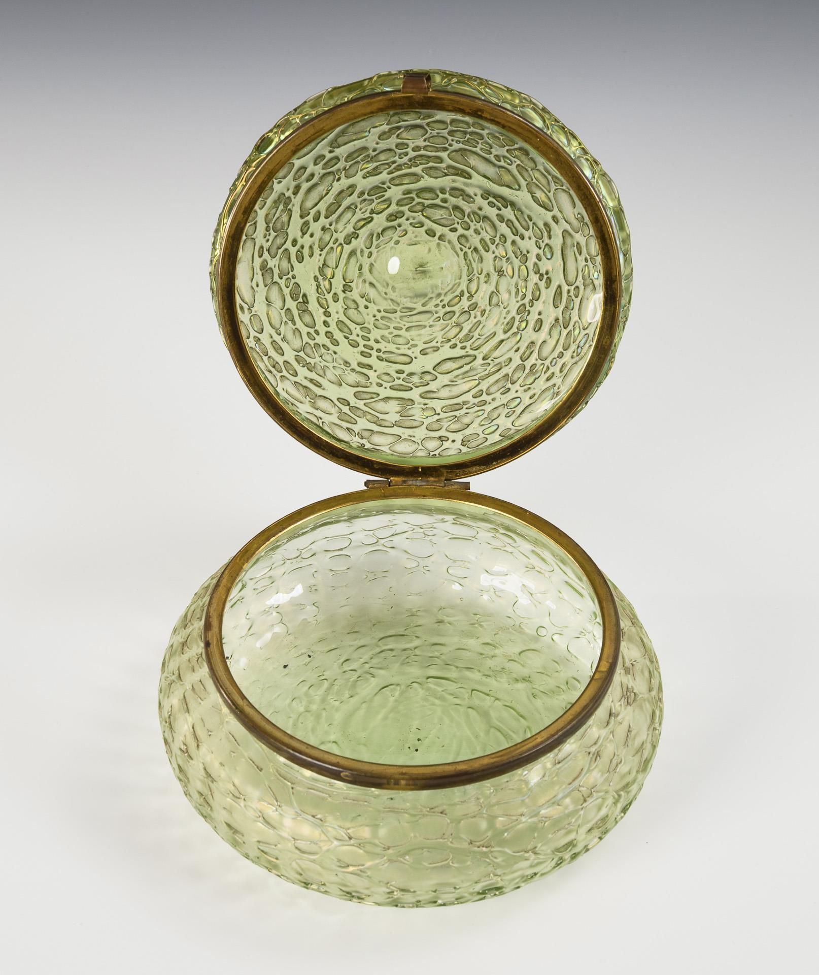 Hellgrünes Uranglas mit farblosen Fäden netzartig umsponnen, irisiert. H 8,5 cm, Ø 16cm.