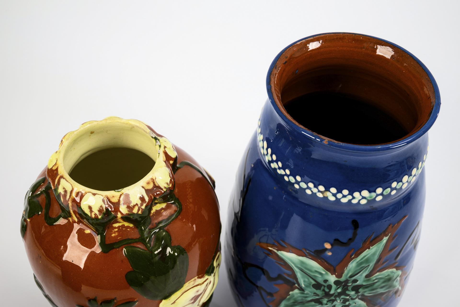 Verschiedene Balusterformen mit farbiger, floraler Bemalung, 1x reliefierte Wandung. Teils Glasurbestoßungen und kleine Abplatzer, partiell bestoßen.