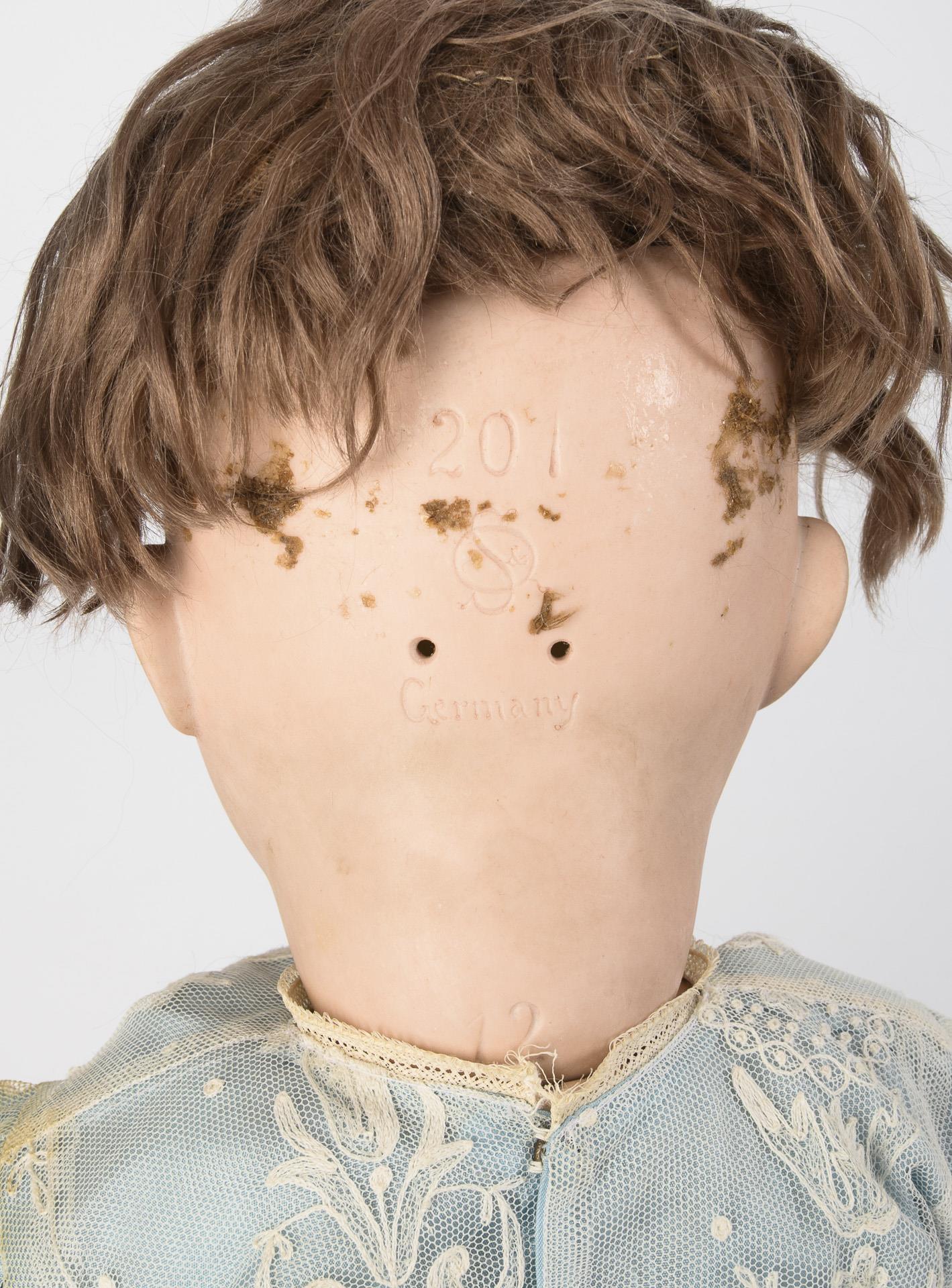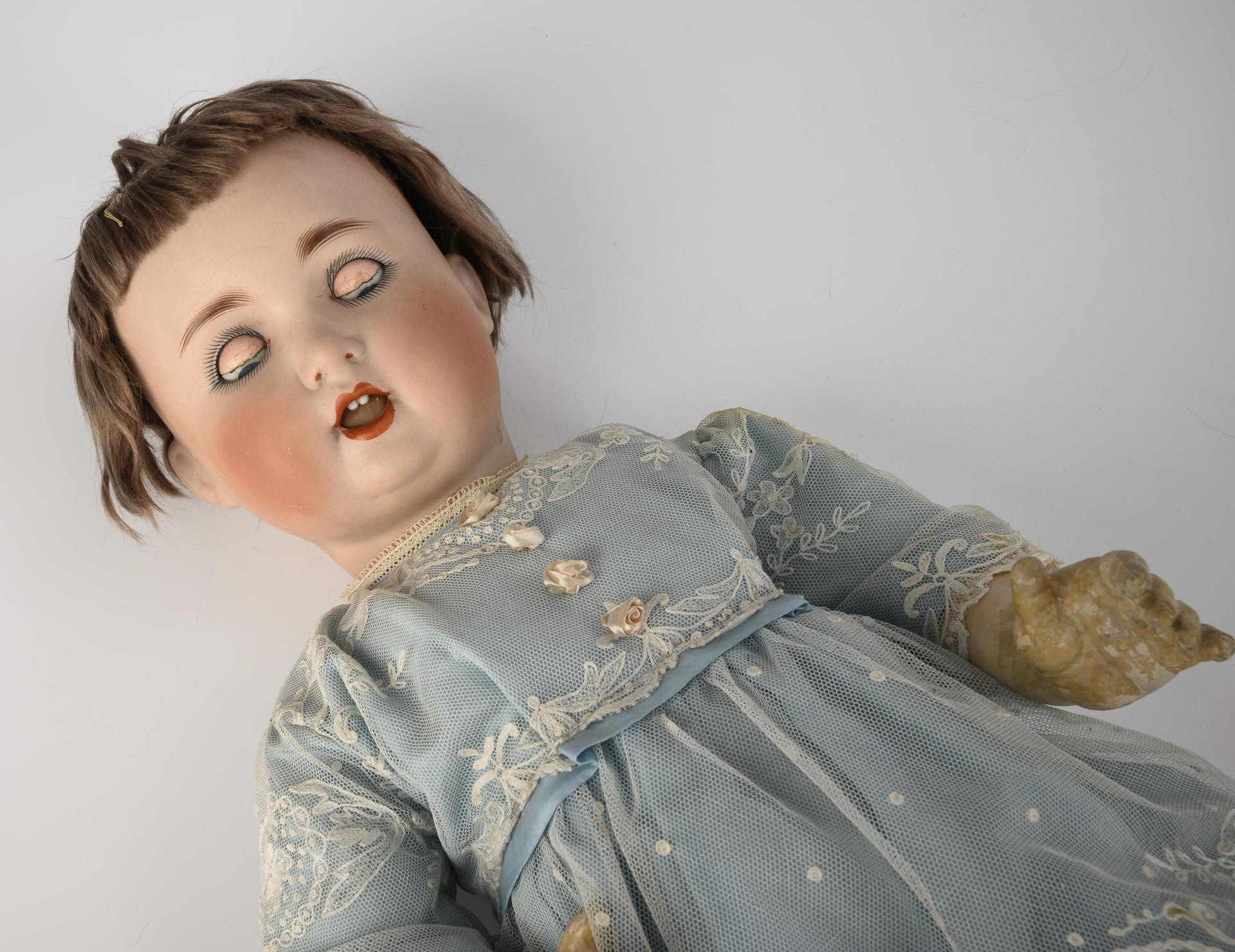 Kurbelkopf, blaue Schlafaugen, offener Mund mit 2 Zähnchen, braune Mohairperücke. 5-teiliger Sitzbabykörper. Blaues Kleid mit Überkleid aus weißer Spitze, weiße Lederschuhe, weiße Haube. Kopf durchleuchtet: ohne Defekte. Körper mit Farbabrieb und Übermalungen.