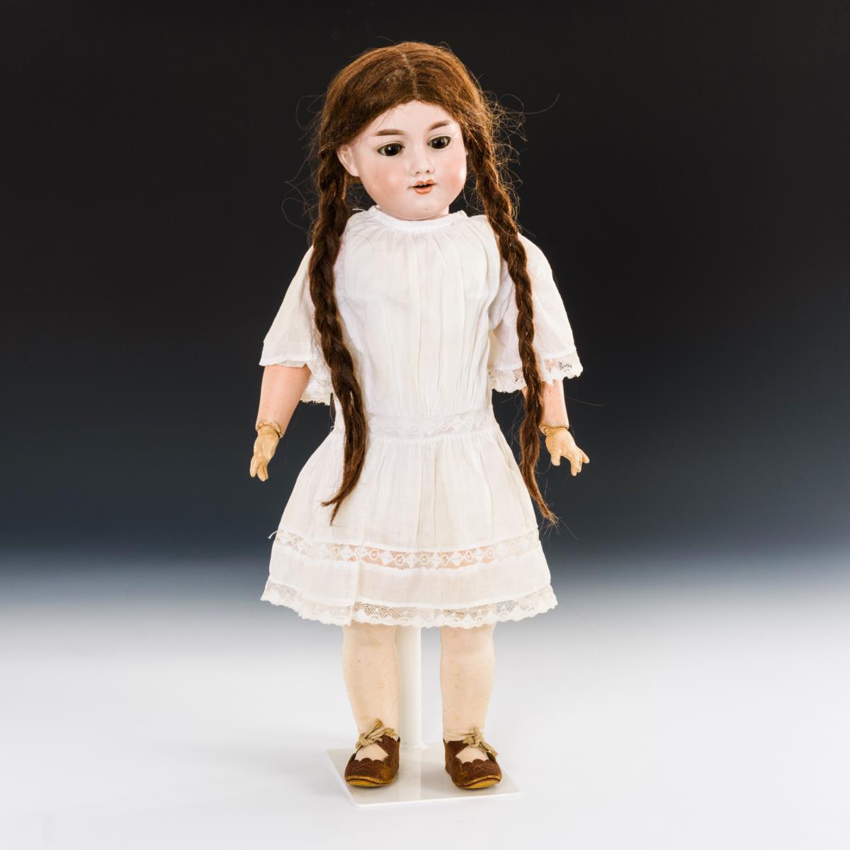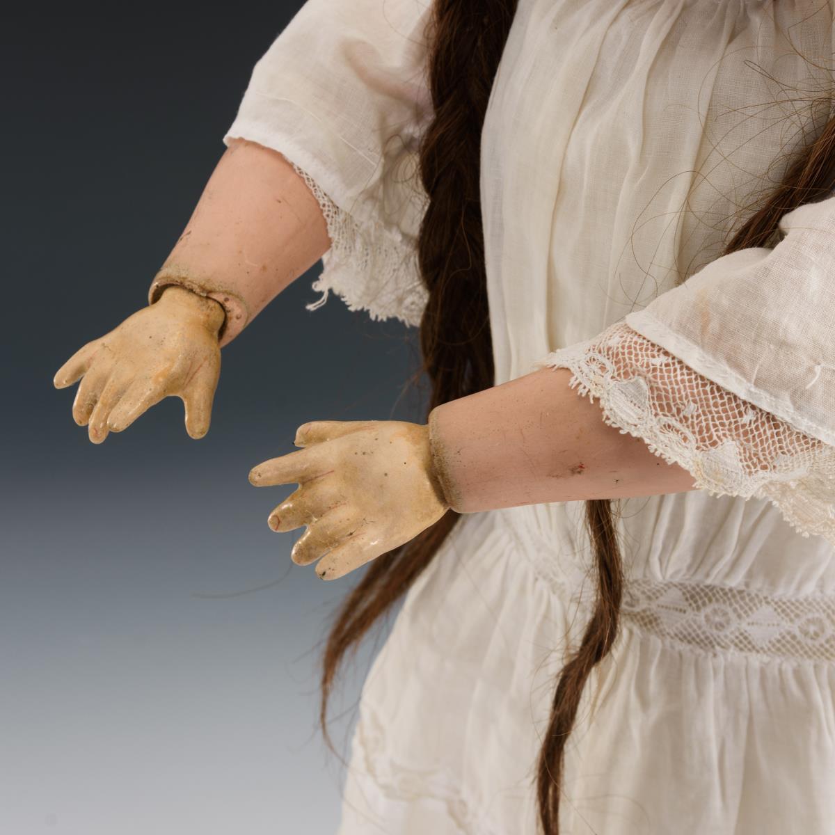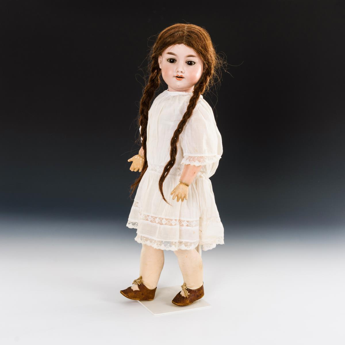 Kurbelkopf, braune Schlafaugen, Echthaarwimpern, braune Echthaarperücke mit Zöpfen. 15-teiliger Gliederkörper. Altes weißes Spitzenkleid. Kopf durchleuchtet: ohne Defekte, Hände farblich abweichend, rechter Fuß bestoßen.