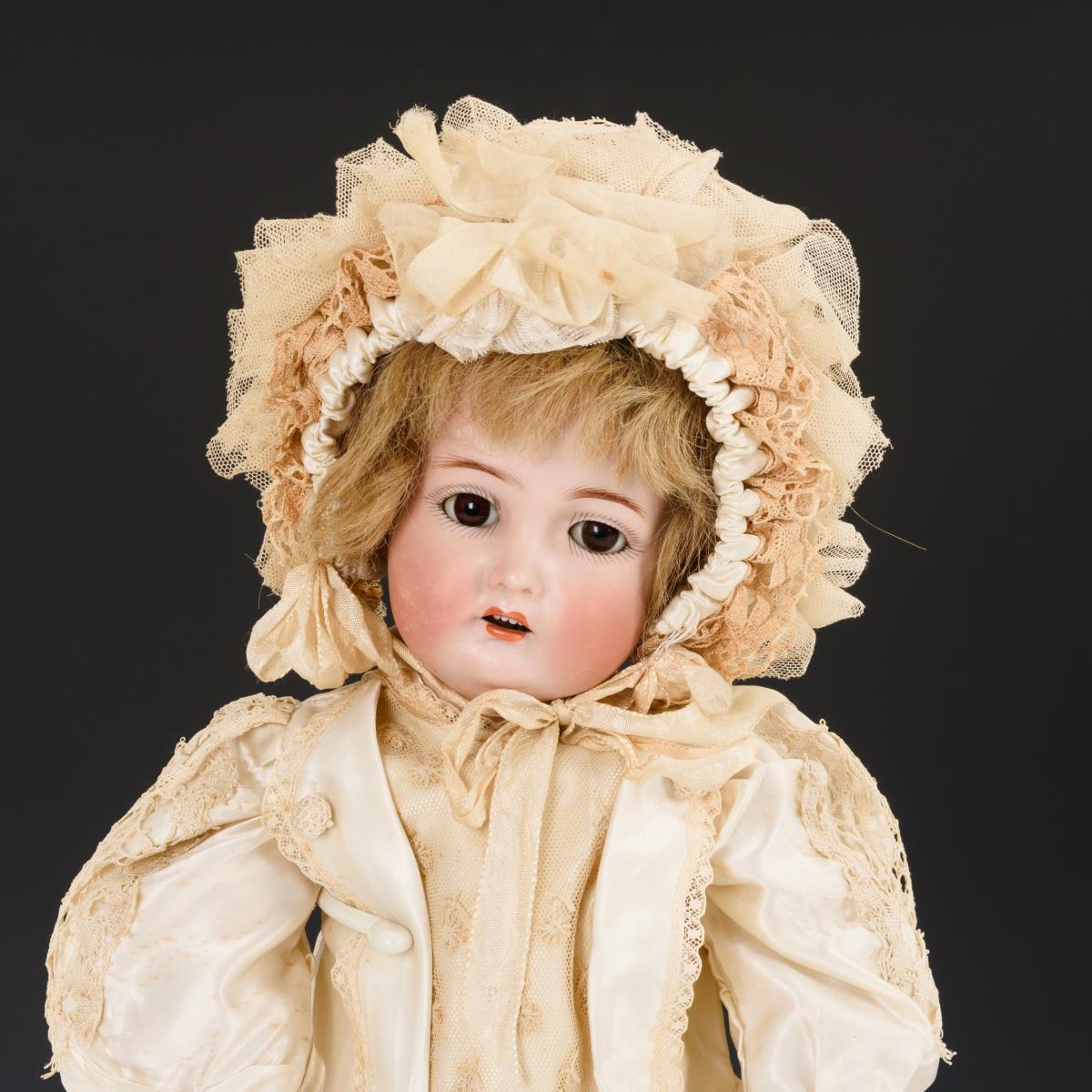 Kurbelkopf, braune Schlafaugen, offener Mund mit Zahnreihe, blonde Echthaarperücke. 15-teiliger Gliederkörper. Cremefarbenes, nachgenähtes Kleid, passende Haube, weiße Lederschuhe. Kopf durchleuchtet, ohne Defekte. Rechte Wange minimal berieben, 2 Finger ergänzt, Hände ausgebessert.