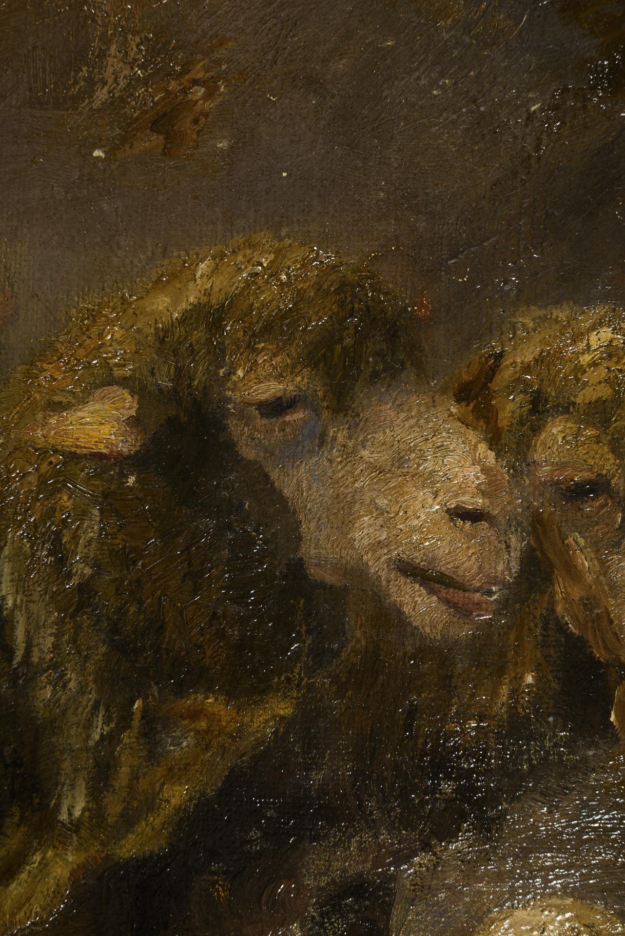 Der alte Hirte mit den Tieren am Morgen vor dem Stall im Sonnenschein. Eine restaurierte Stelle mit Hinterklebung.