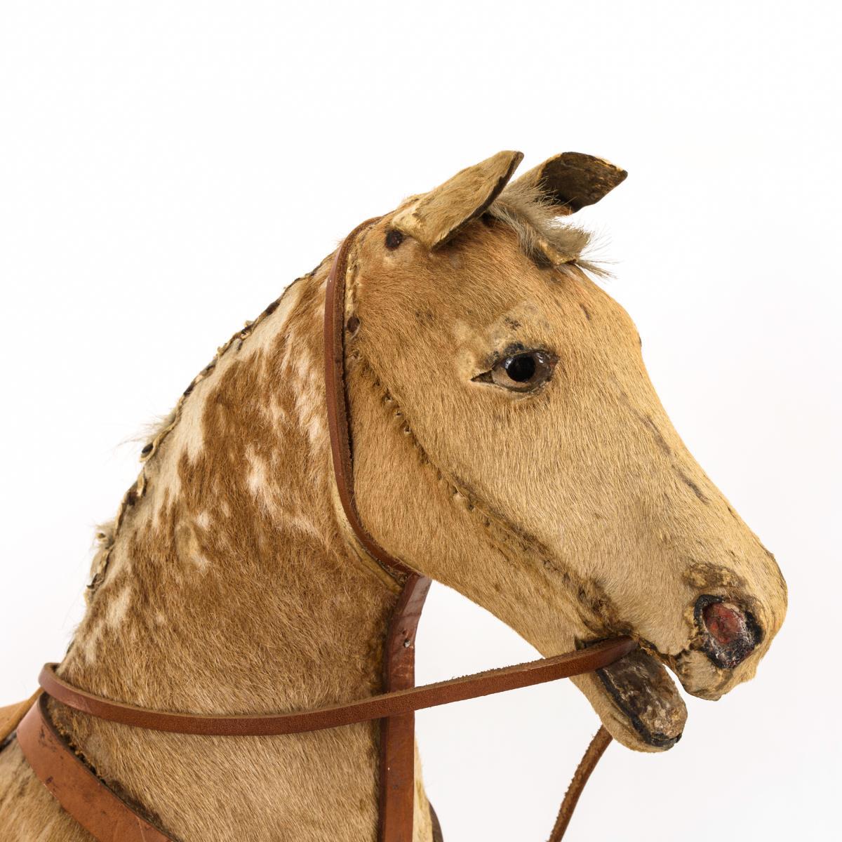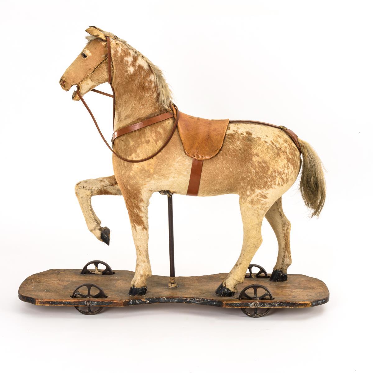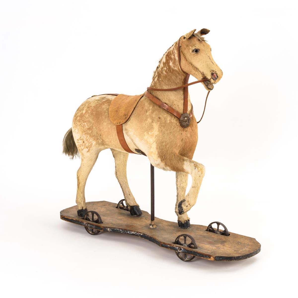 Auf einer Holzplatte mit vier Rädern stehendes Pferd mit Lederzaumzeug und -sattel. Alter- und Gebrauchsspuren, inaktiver Anobienbefall.