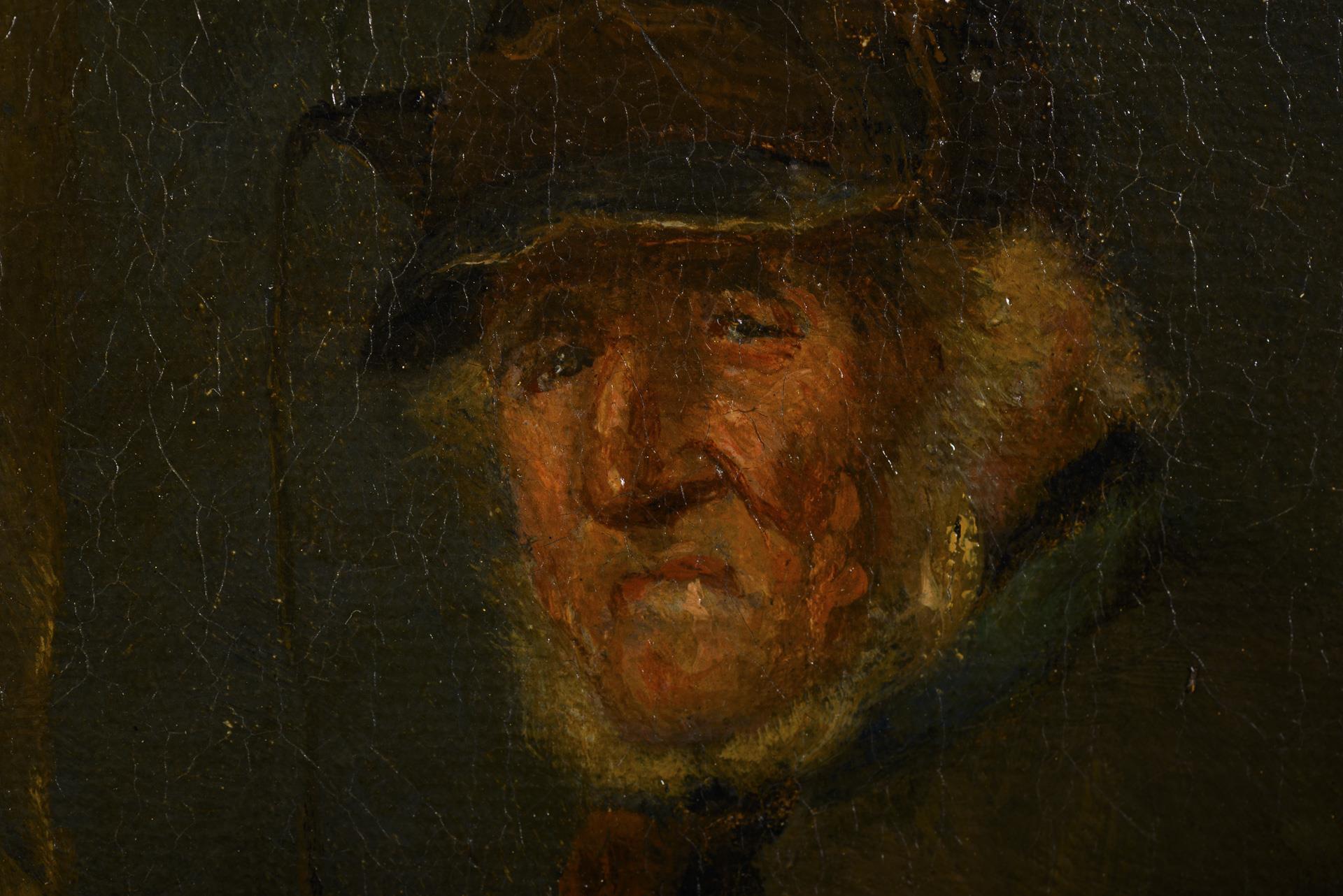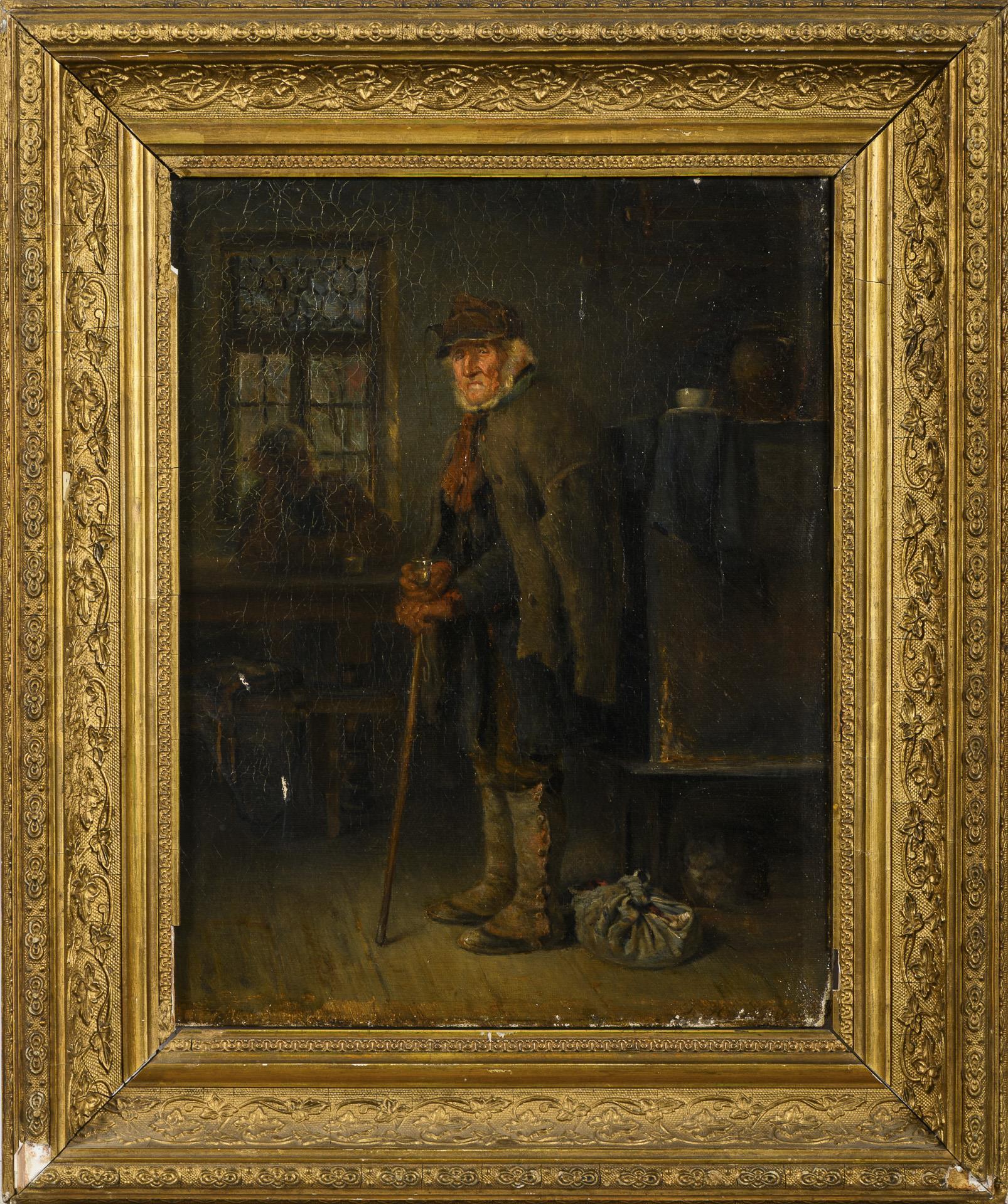 Alter Mann mit Stock und Bündel beim Trinken in der Stube nahe dem Ofen. Kratzer.