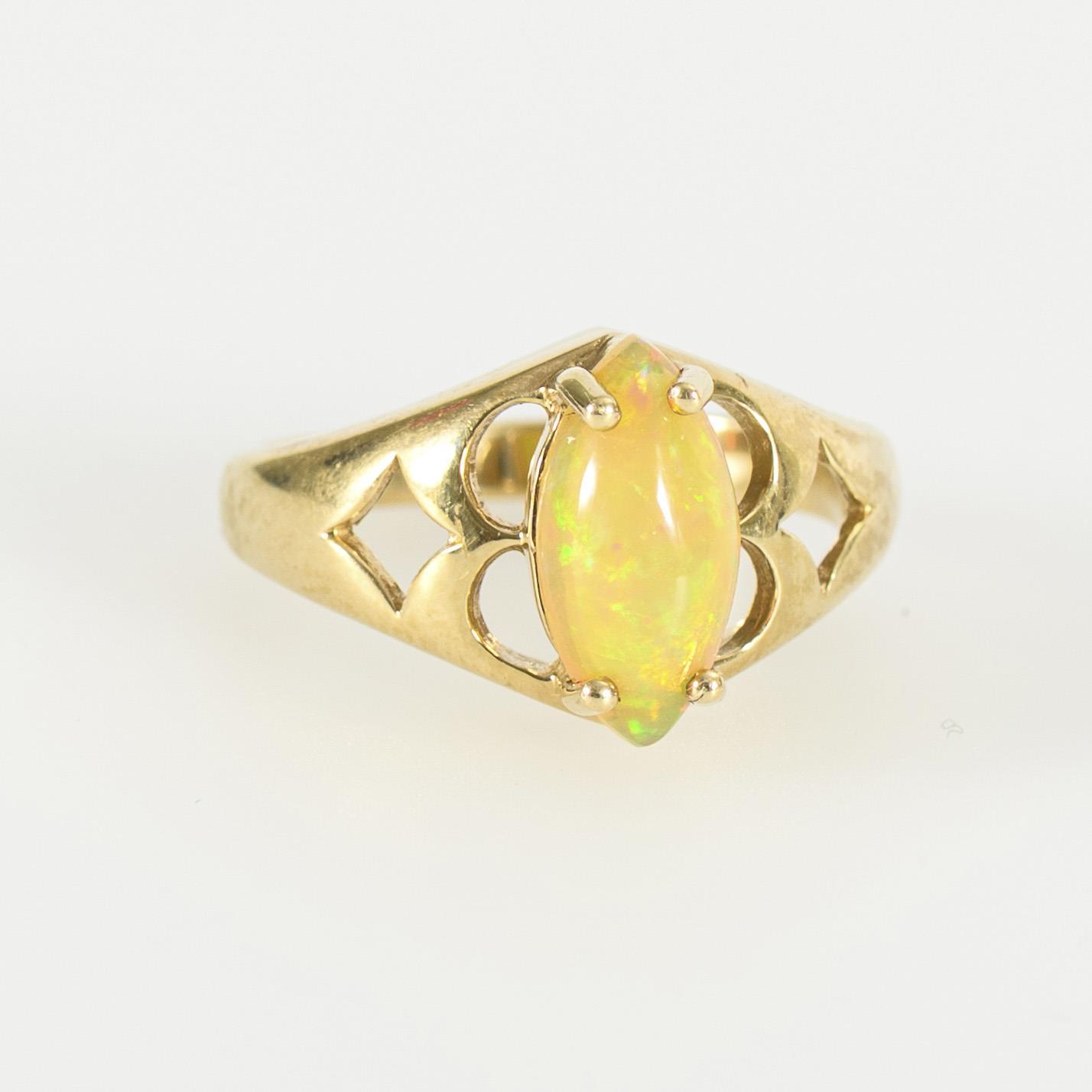 Ring mit sich zum Ringkopf verbreiternder, offen gestalteter Schiene mit einer zentralen, krappengefassten Opalnavette. Leichte Tragespuren am Gold.
