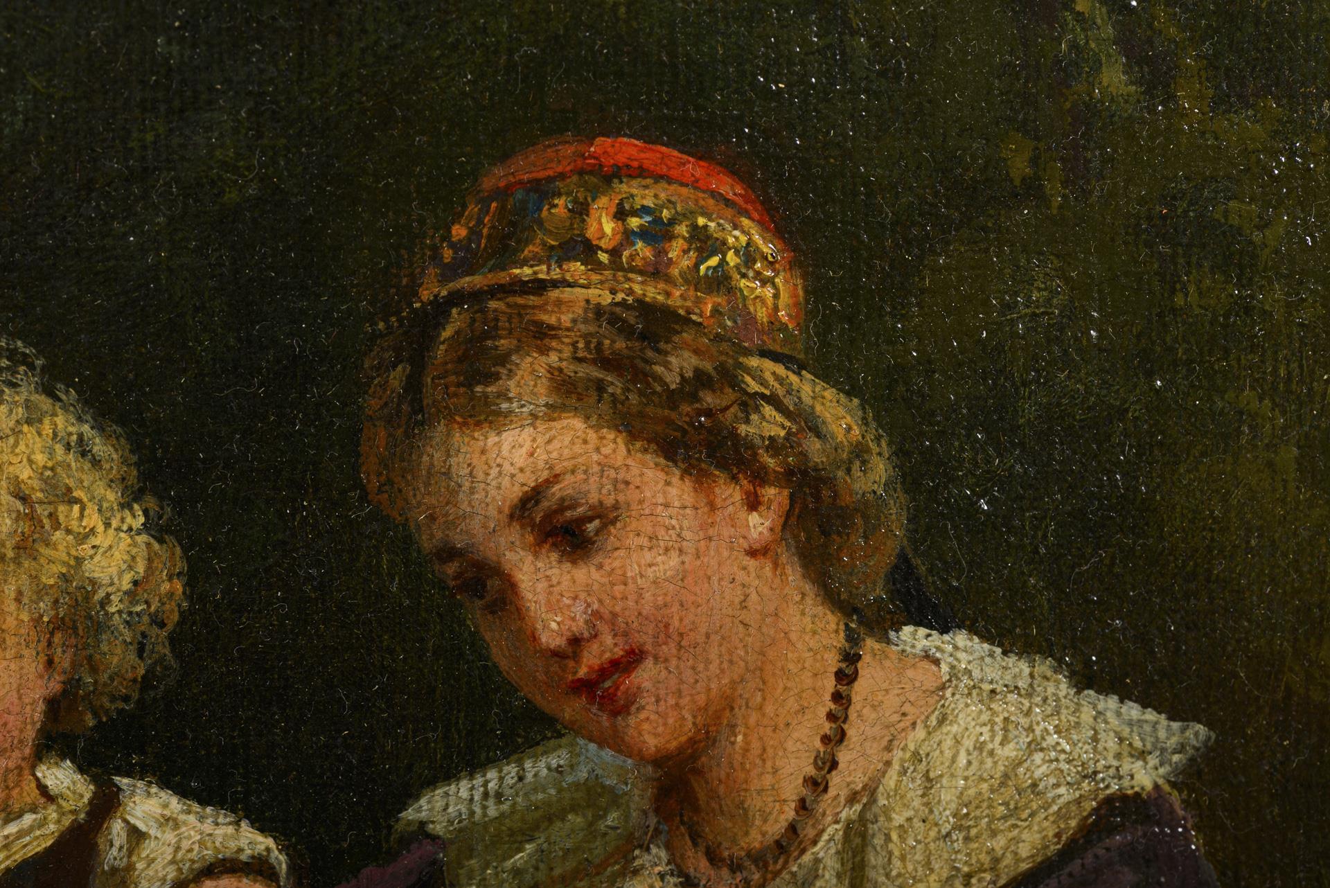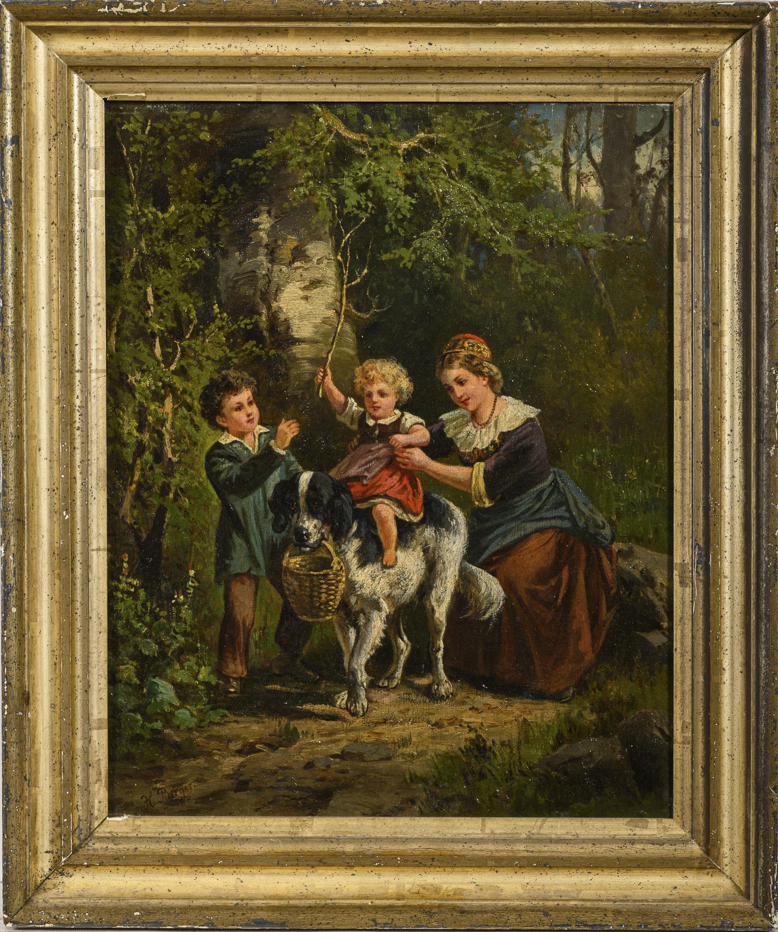 Genreszene mit Mutter, Kindern und dem Familienhund auf einem Weg am Wald. Leichte Altersspuren.