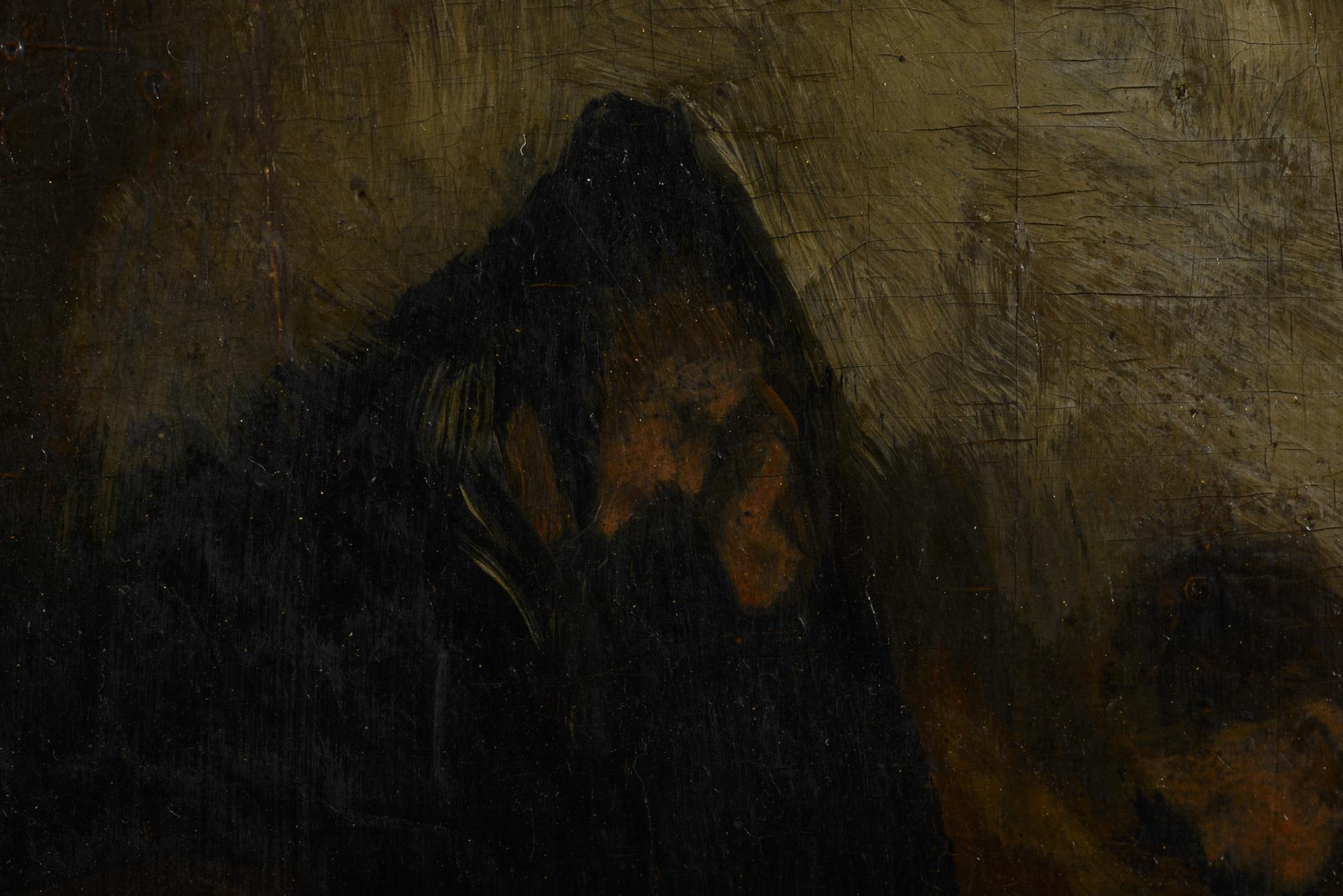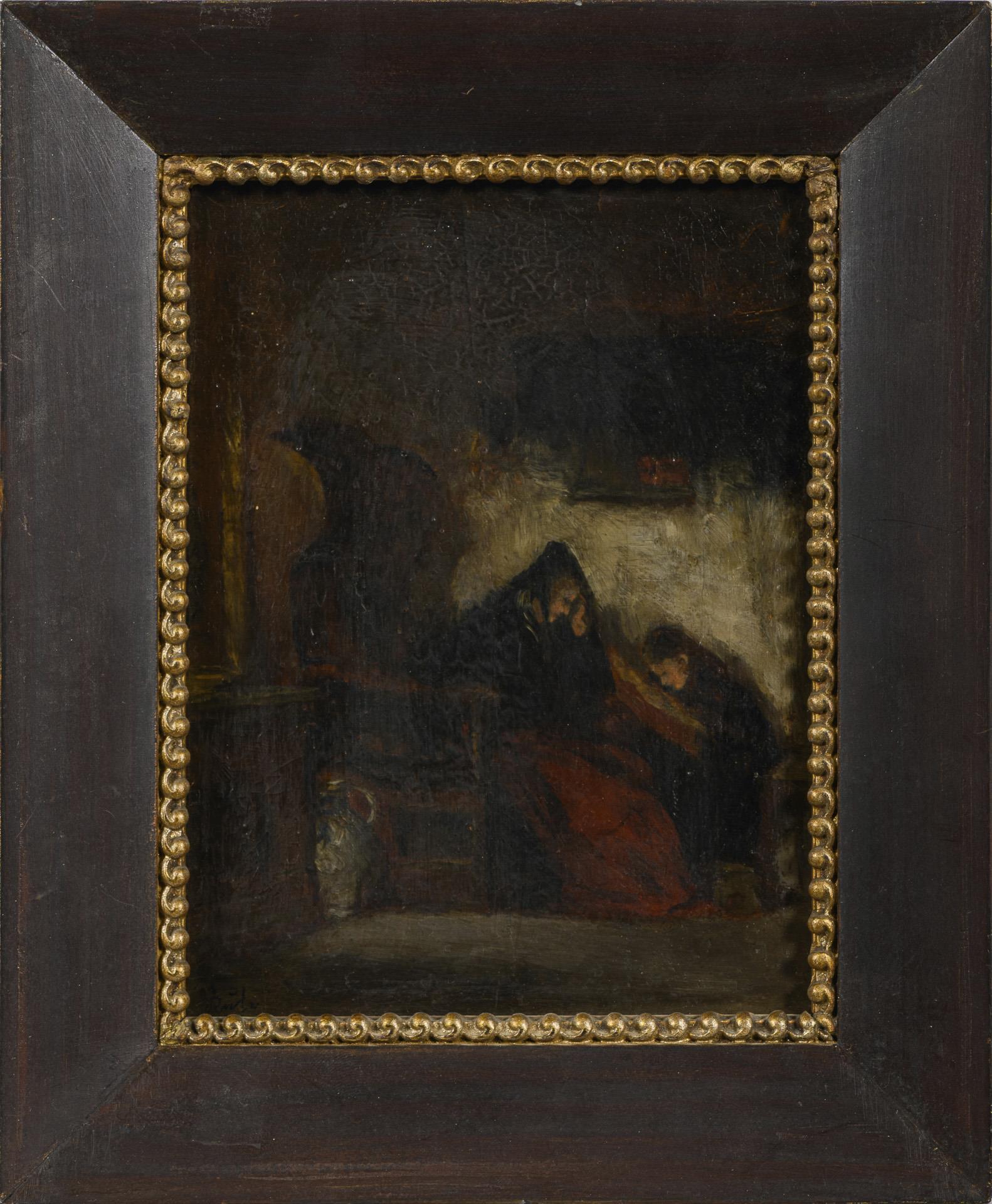 Mutter und Kind in Tracht in der Stube auf einer Bank. Altersspuren.
