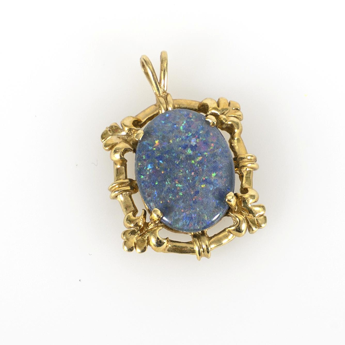 Anhänger mit einer ovalen Opaltriplette, krappengefasst in einem ornamental ausgestalteten Rahmen, die Öse starr.