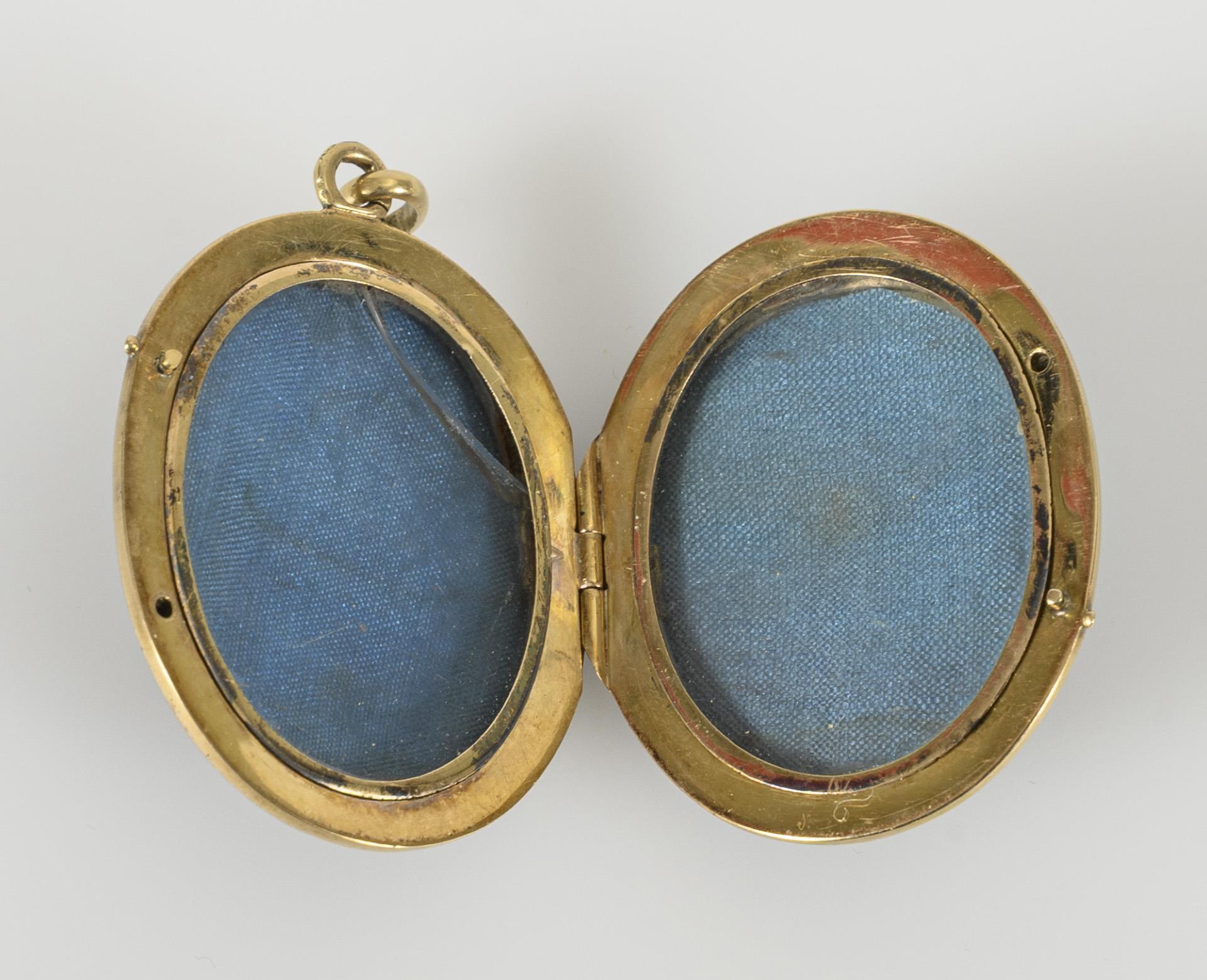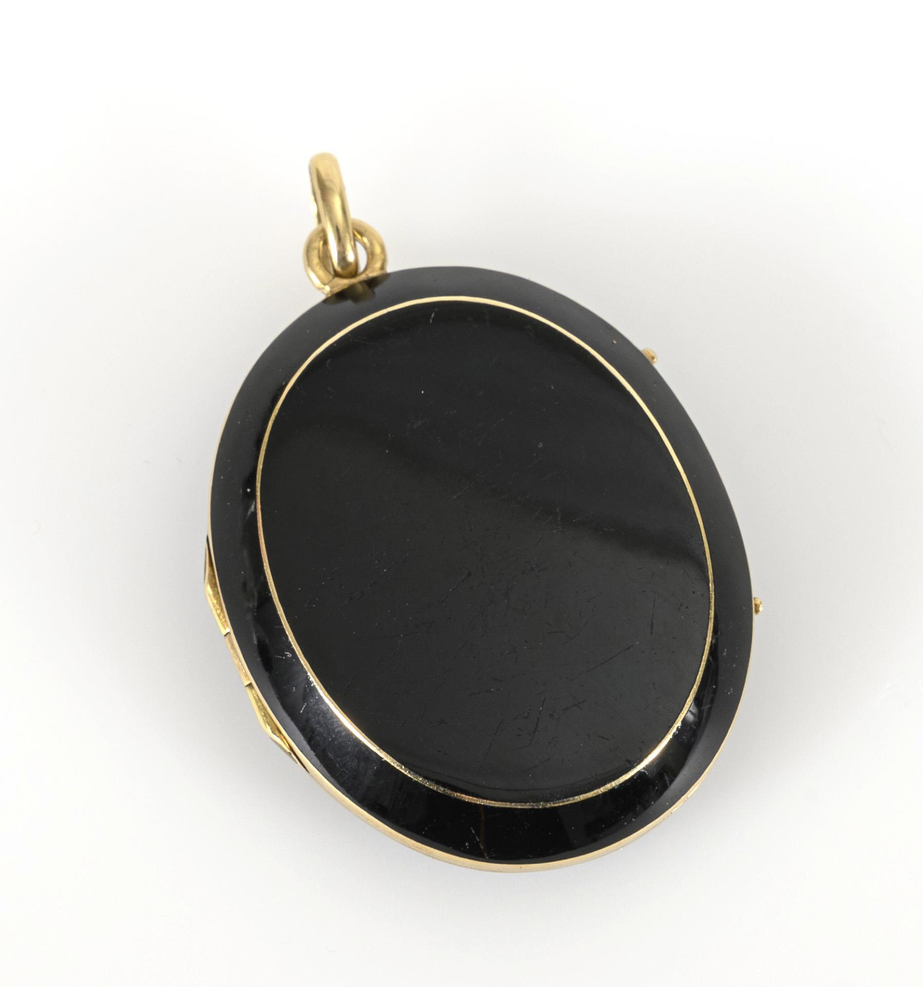 Historisches Medaillon, 2. Hälfte des 19. Jahrhunderts, mit eingelassener Saatperlenblüte in schwarzem Emaille. Innen mit vollständiger Rahmung (ein Glas seitlich gesprungen) und beweglicher Öse. Altersgemäße Tragespuren, seitlich zur Blüte Abplatzung im Emaille (13,44 x max. 1,72 mm), diese nicht bis auf das Auflegemedium durchgehend, sodass die Fehlstelle im getragenen Zustand kaum auffällig ist.