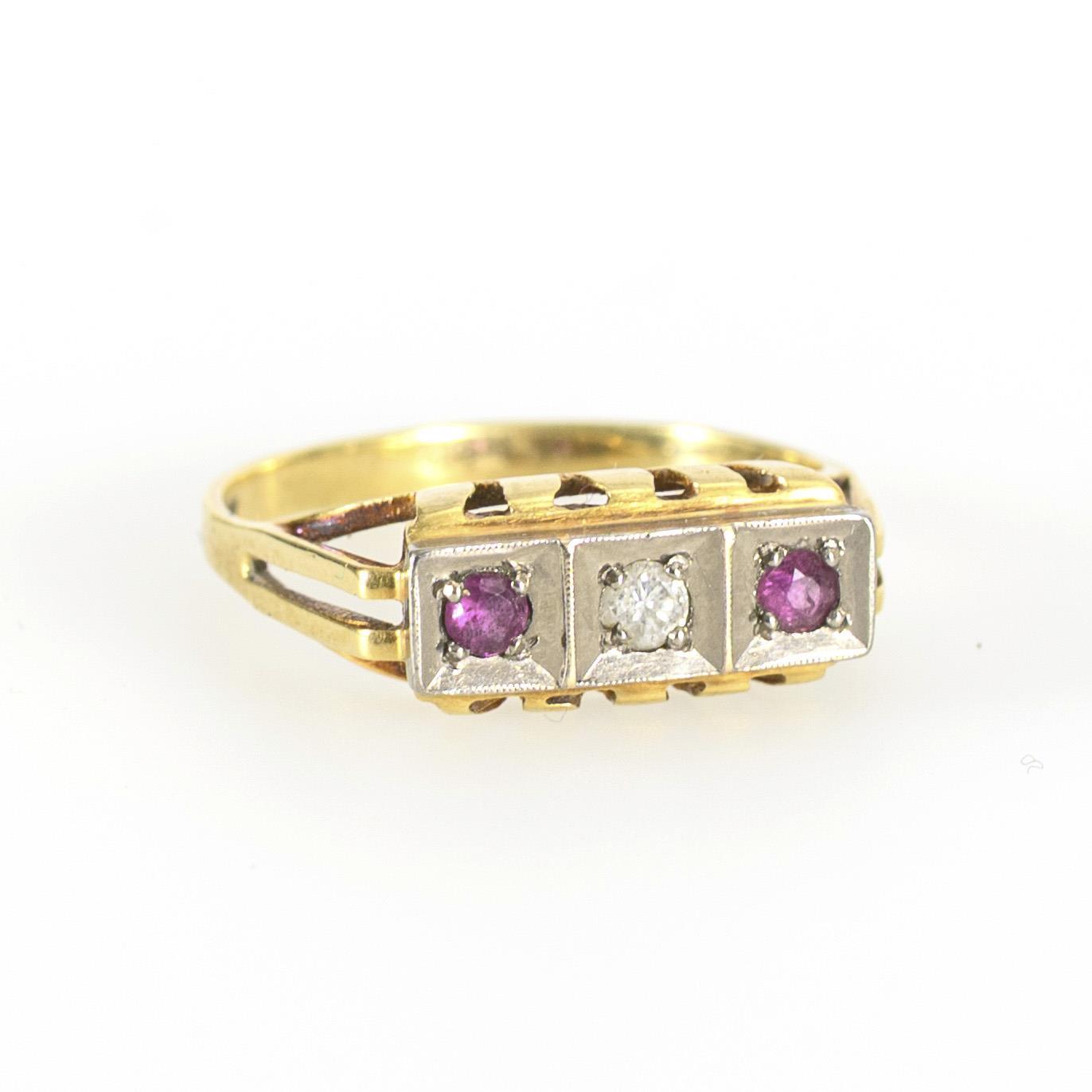 Ring aus der Zeit des Art déco in zweifarbiger Gestaltung mit einem Brillanten sowie 2 roten Farbsteinen, wohl Rubinen, diese in Weißgold gefasst, in einem Ringkopf aus Gelbgold sowie an einer Gelbgold-Schiene. Unterseitig mit leichten, altersgemäßen Tragespuren.