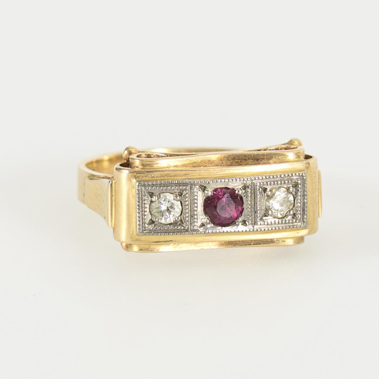 Allianzring aus der Zeit des Art déco mit einem kleinen roten Farbstein, wohl Rubin, flankiert von 2 Brillanten. Der Ring ist zweifarbig ausgestaltet: Kopf und Schiene sind in Gelbgold, die Millegriffes-verzierte Fassung des Steinbesatzes ist in Weißgold gehalten. Unterseitig mit leichten, altersbedingten Tragespuren.