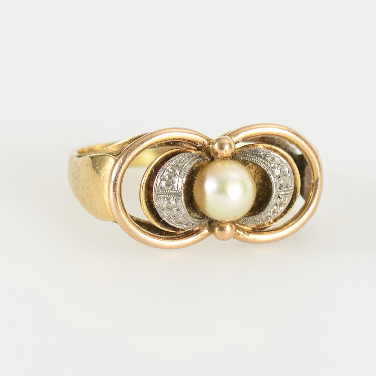 Ring, zentral mit einer Perle in einem durchbrochen gearbeiteten Ringkopf, umgeben von zwei Bandelementen in Weißgold, deren Textur eingelassene Diamanten nachahmt.