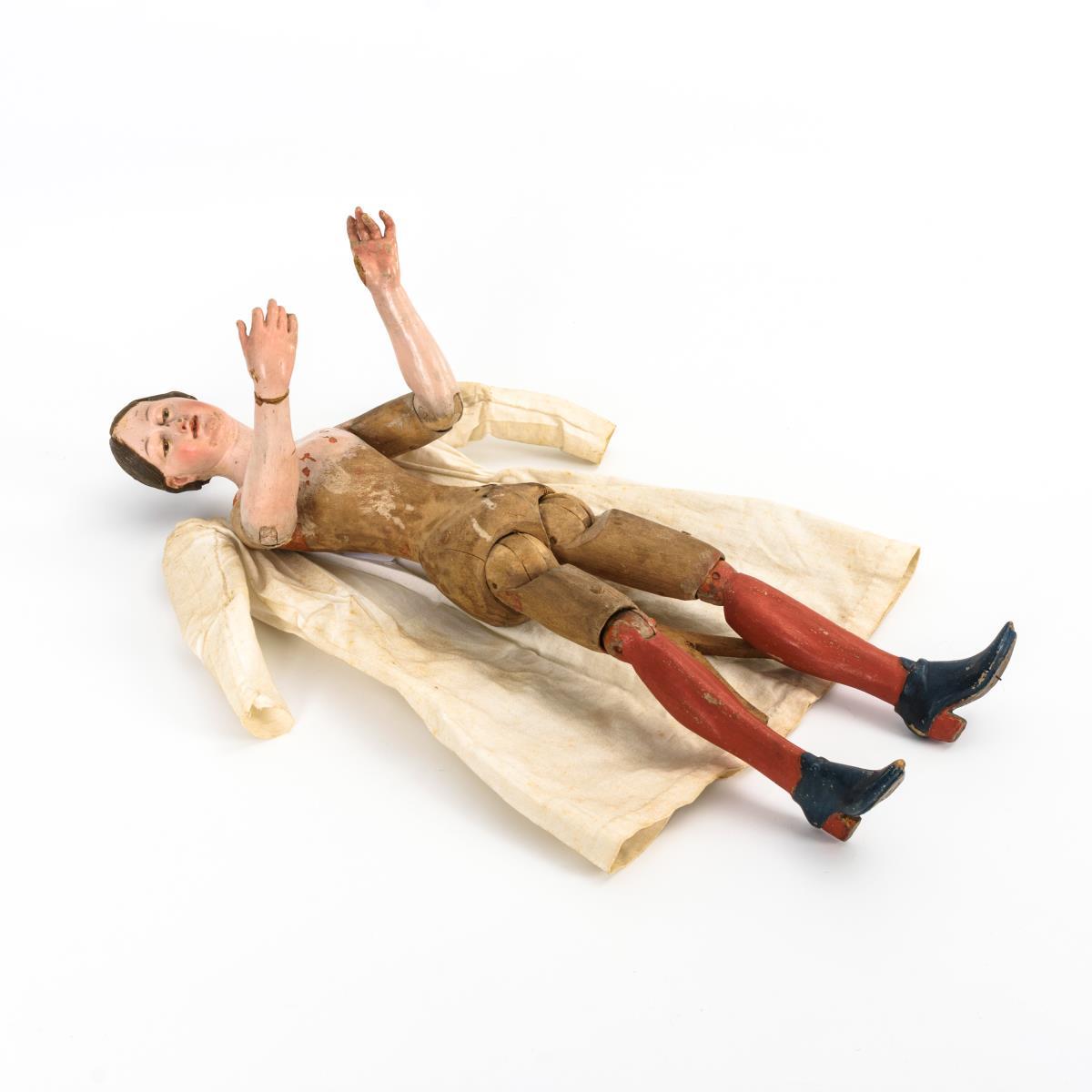 Holz, polychrom gefasst, Haare aus gefärbten Wachs, weißes Baumwollkleid. H sitzend 33 cm, stehend 40 cm.