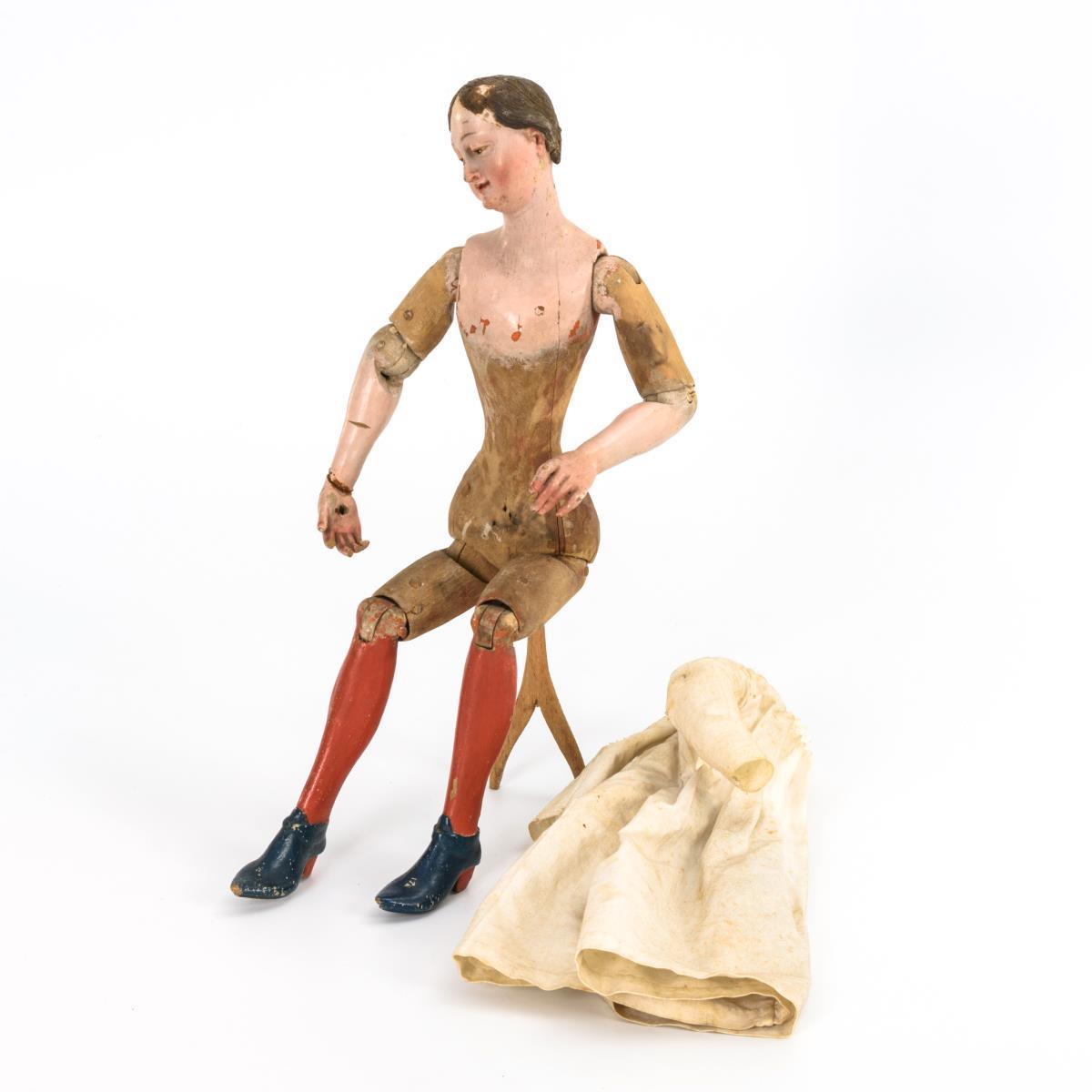 Wohl als Sitzfigur konzipierte Frau mit 8 beweglichen Holzgelenken sowie ausdrucksstarker barocker Kopf- und fingerhaltung. 1 Handgelenk geklebt, einige Finger fehlen, kaum Trockenrisse, Originalfassung und Wachshaare teils etwas bestoßen.