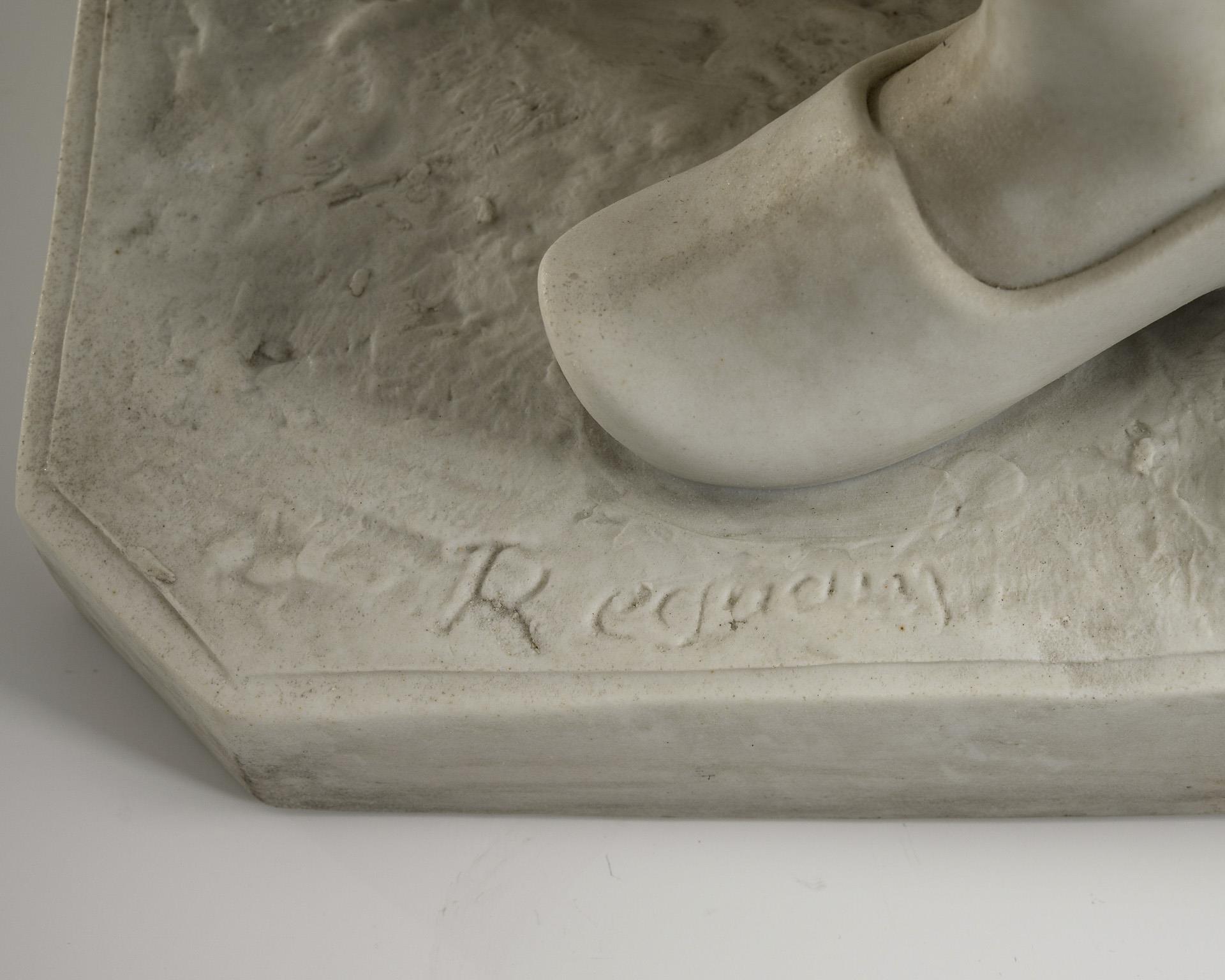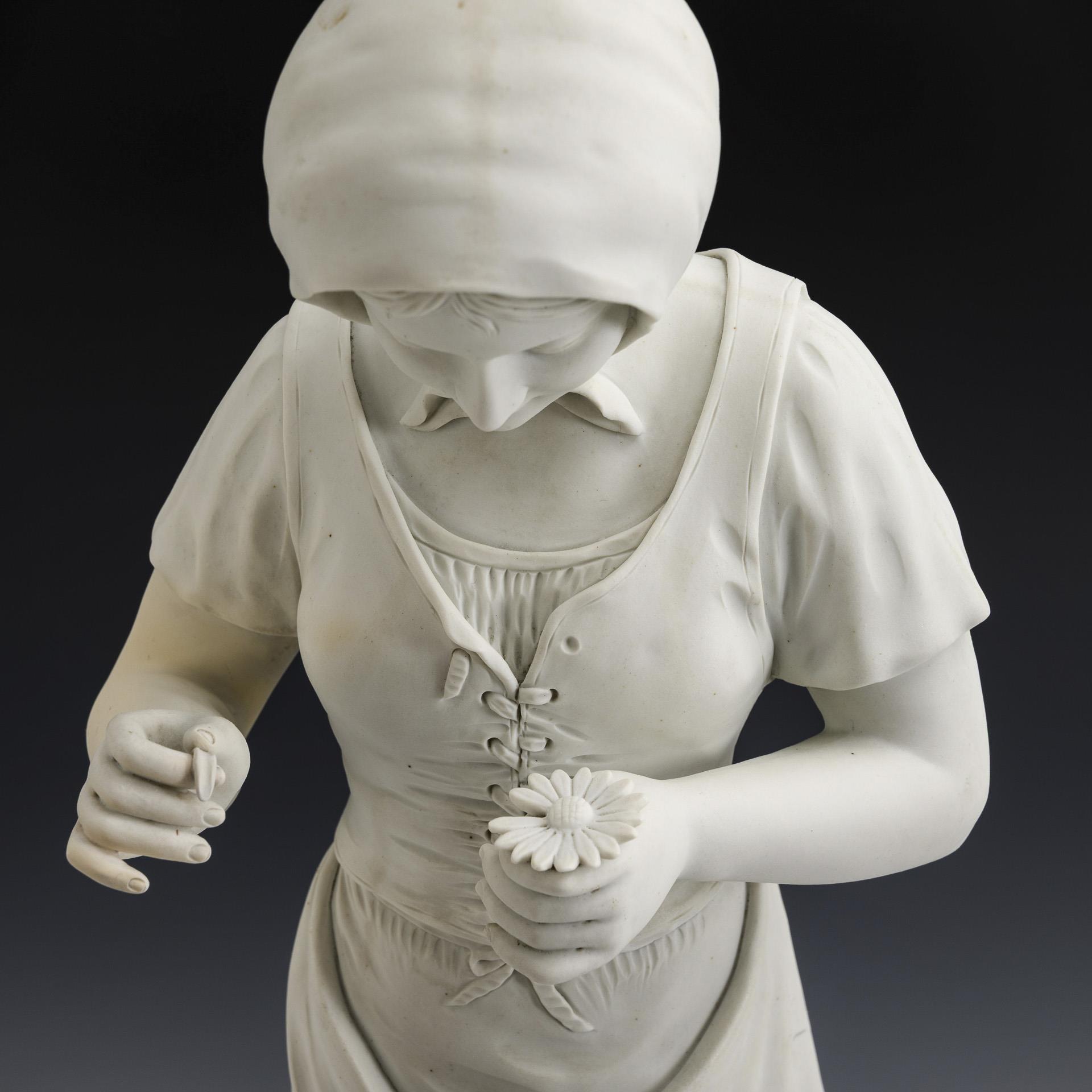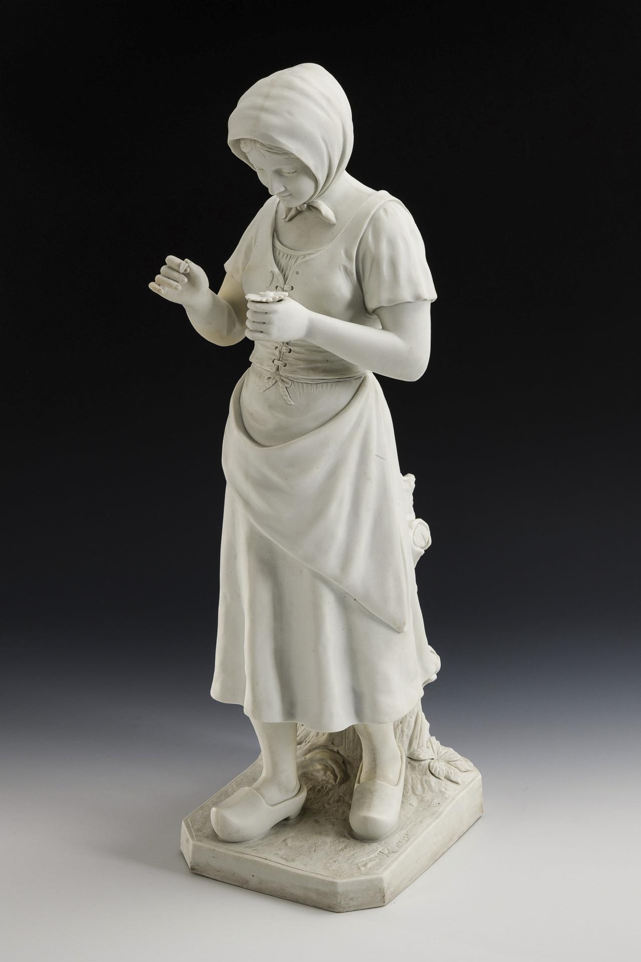 An einem Baumstamm stehendes eine Blüte in der Hand haltendes und Blütenblätter zupfendes Mädchen. Verso am Sockel restauriert.