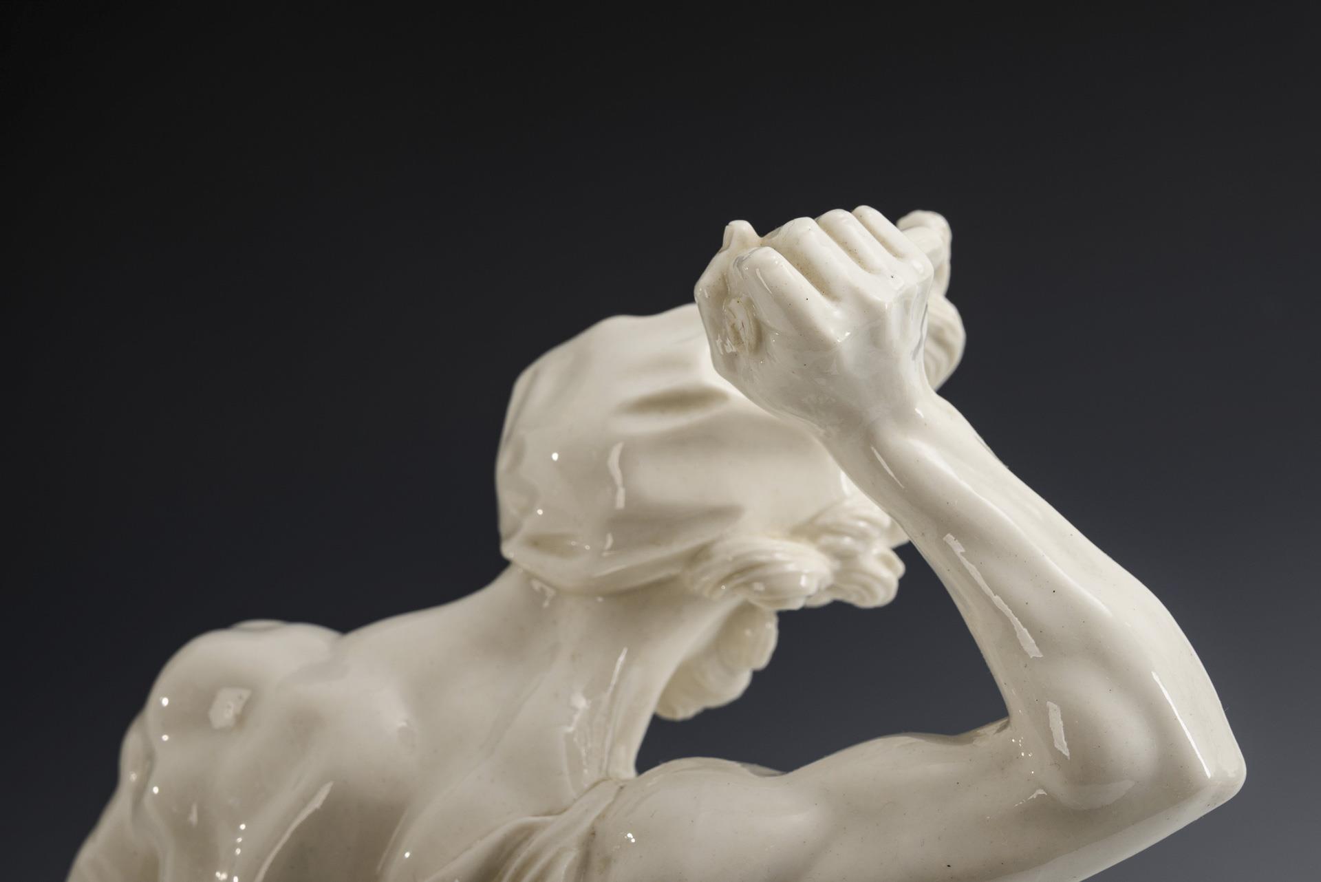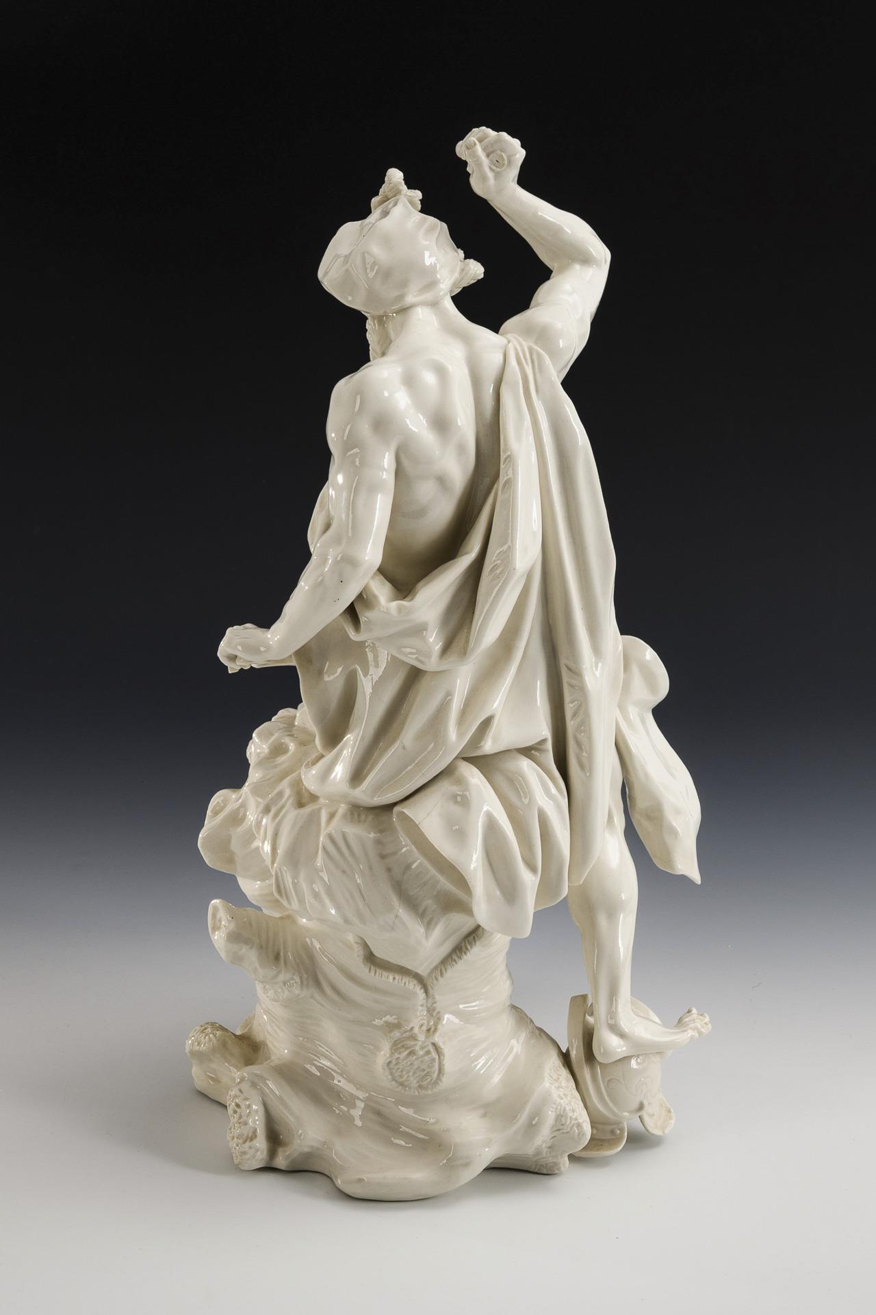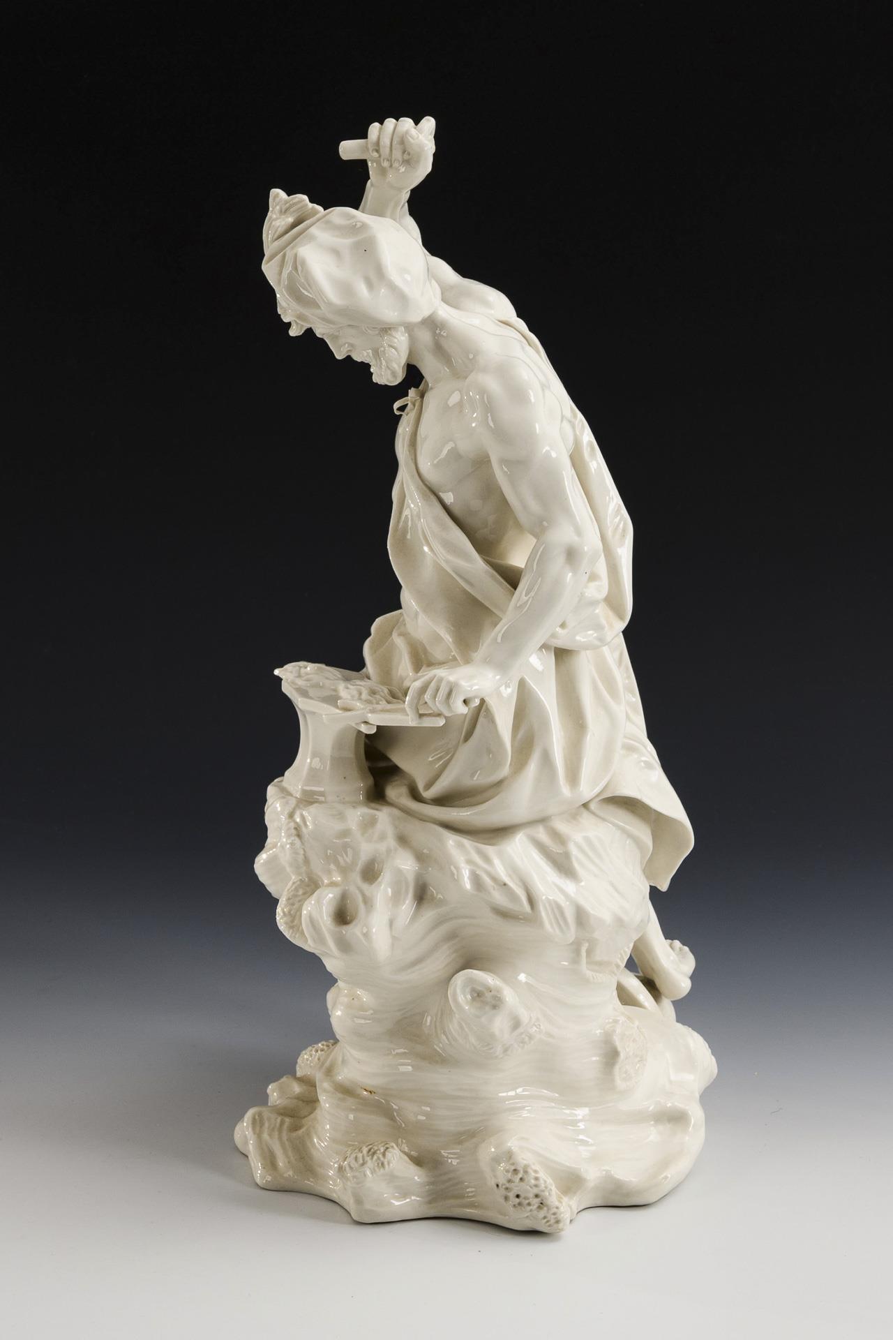 Auf einem Natursockel sitzender, ein Blitzbündel auf dem Amboss schmiedender Vulkan. Hammer defekt, verso Haarriss in Gewand und Sockel.