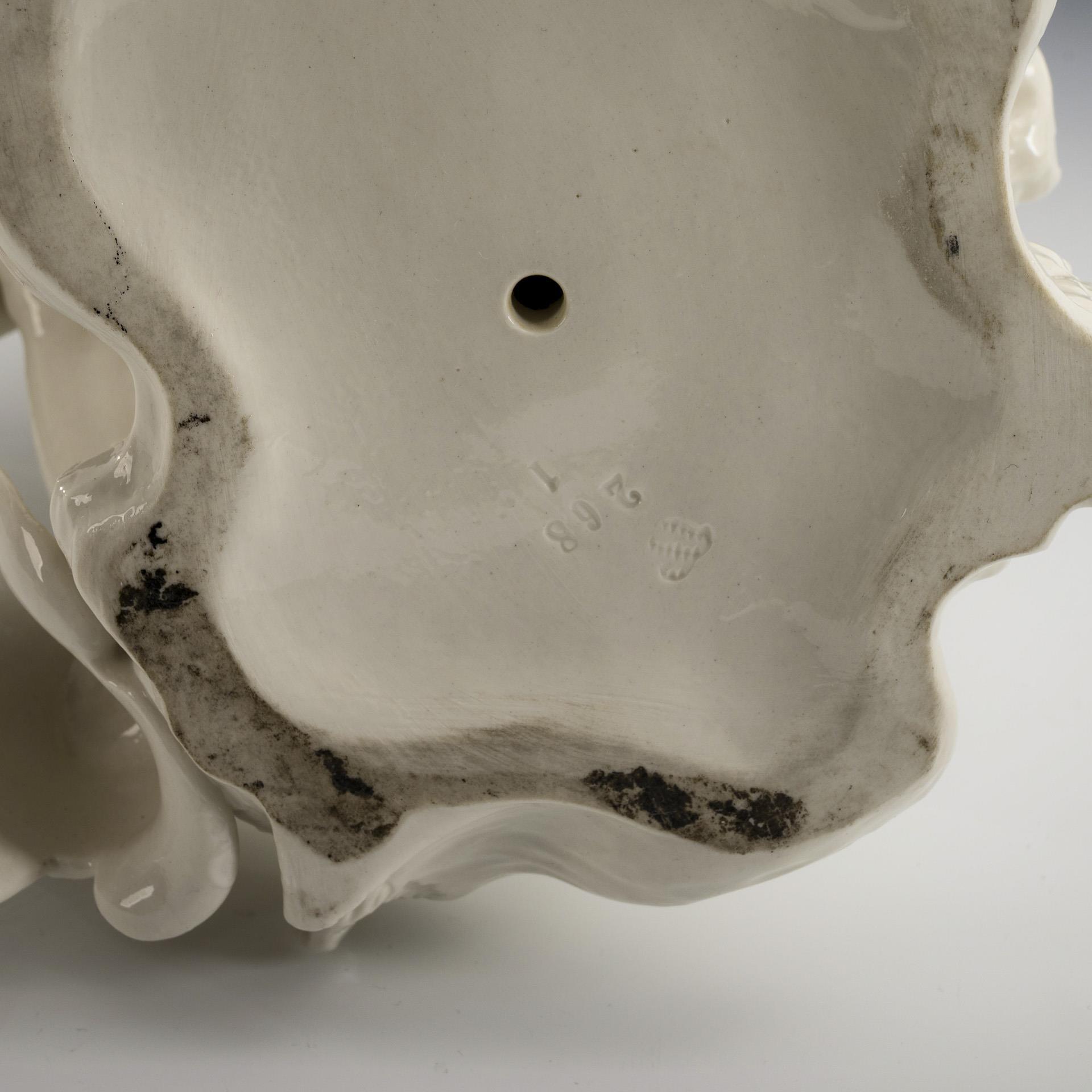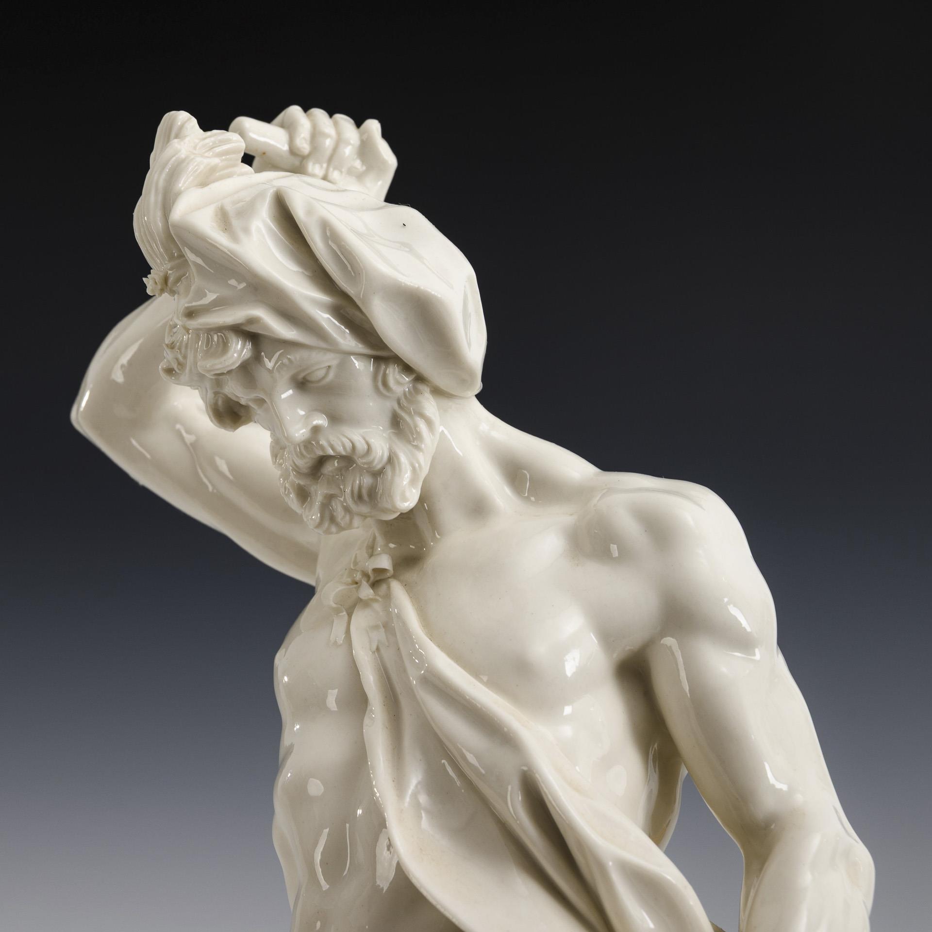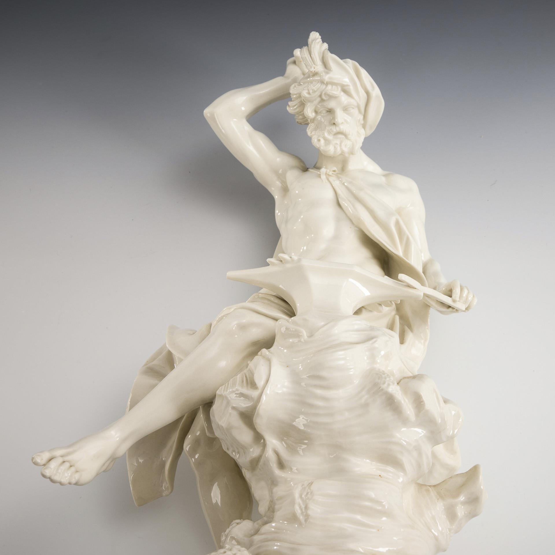 Auf einem Natursockel sitzender, ein Blitzbündel auf dem Amboss schmiedender Vulkan. Hammer defekt, verso Haarriss in Gewand und Sockel.