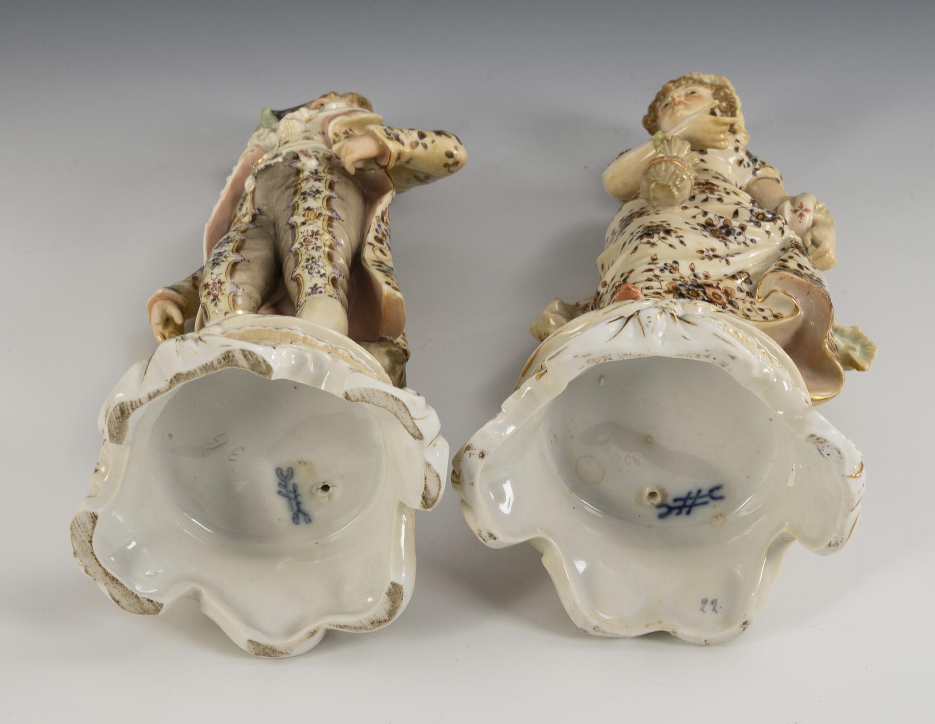 Je auf einem Rocaillesockel stehende Dame mit Körbchen und Fächer bzw. Kavalier mit Stock und Zweispitz. Partieller Goldabrieb, Fächer bestoßen.