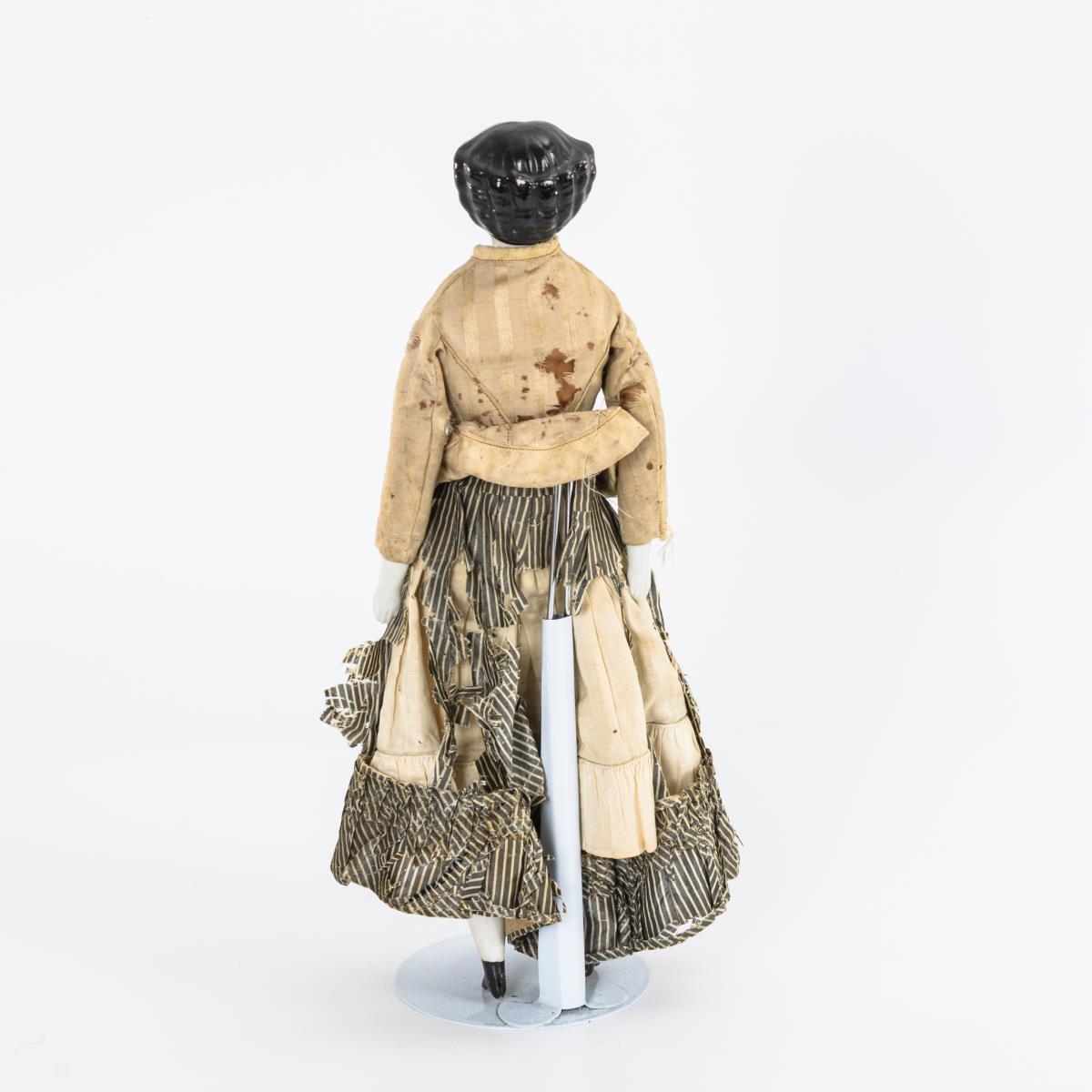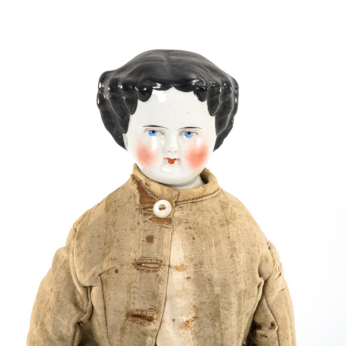 Glasierter Brustkopf mit modellierten Haaren. Alter Körper mit glasierten Porzellanarmen und -beinen. Originaler Rock mit Jacke. Kleidung stark zerschlissen, linke Schuhspitze bestoßen.