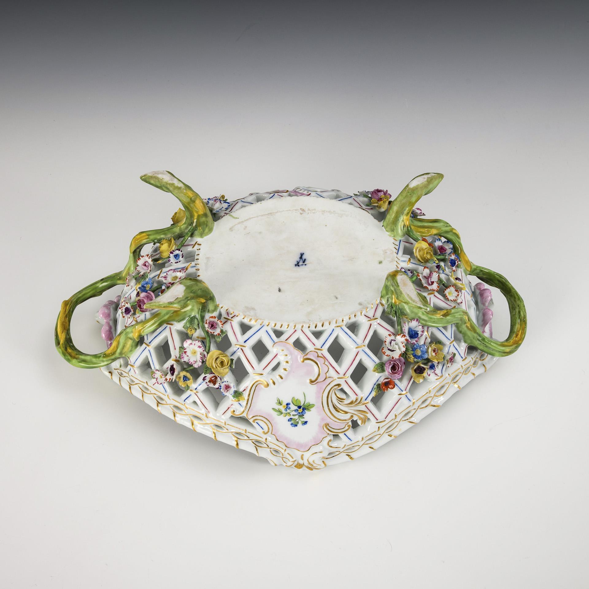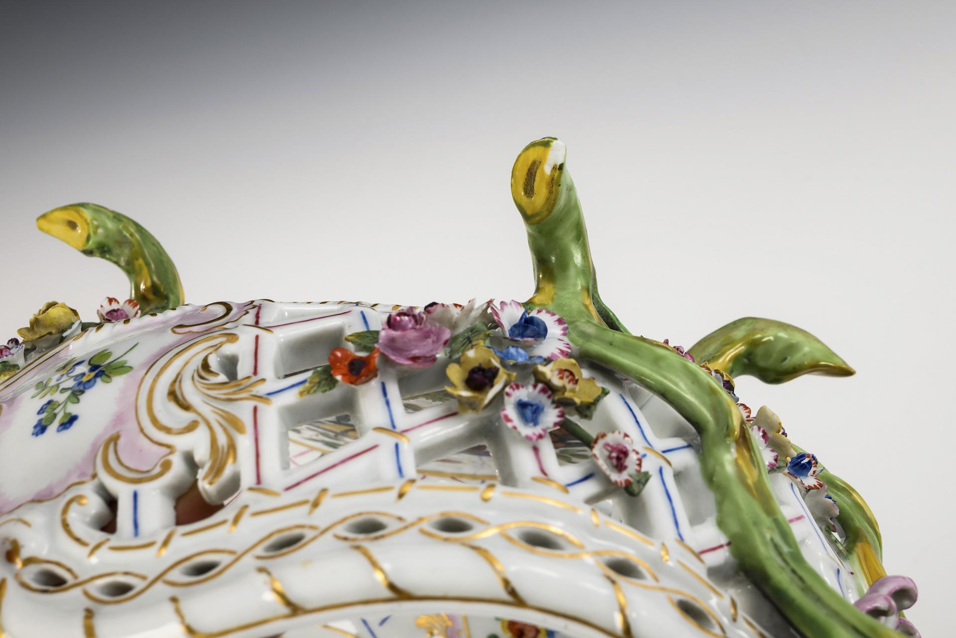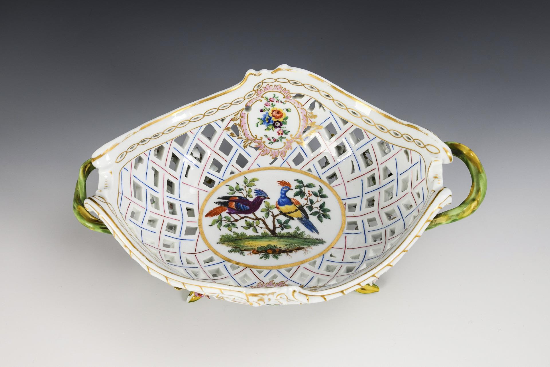 Vierpassiger Korb mit gitterdurchbrochener Wandung, zwei Asthandhaben mit insgesamt vier Astfüßen, reichem Blütenbelag sowie Blumen- und Vogelmalerei. Bestoßungen am Belag.